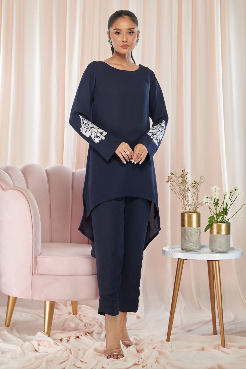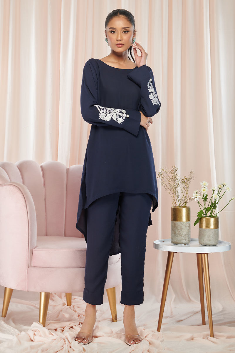 Embrace elegance with this navy blue georgette shirt adorned with exquisite embroidery motifs. The embroidery motifs add a touch of sophistication and intricate detailing to the outfit. The hi-lo cut design creates a modern and flattering silhouette, adding a stylish twist to the classic shirt.