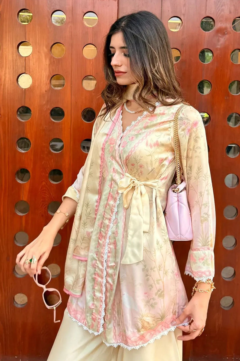 Step into calm luxury and feminine softness with this shamooz silk co ord set that features butter-yellow and blush color palette. This is a wrap-style kurta that features wide sleeves and delicate edging and an overall unique cut, paired with flowing palazzo pants in matching butter tones and a similarly printed scarf making it perfect for festive brunches, bridal showers, or an elegant summer evening
