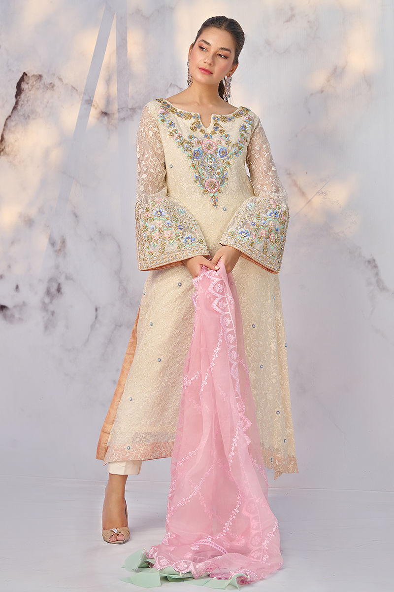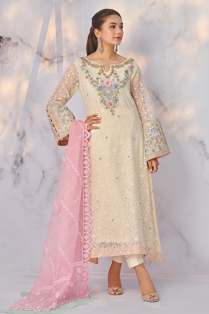 Embroiderer Cotton net shirt heavily embellished with hand embroidery and resham embroidery. Organza dupatta with cutwork border and organza tassels.