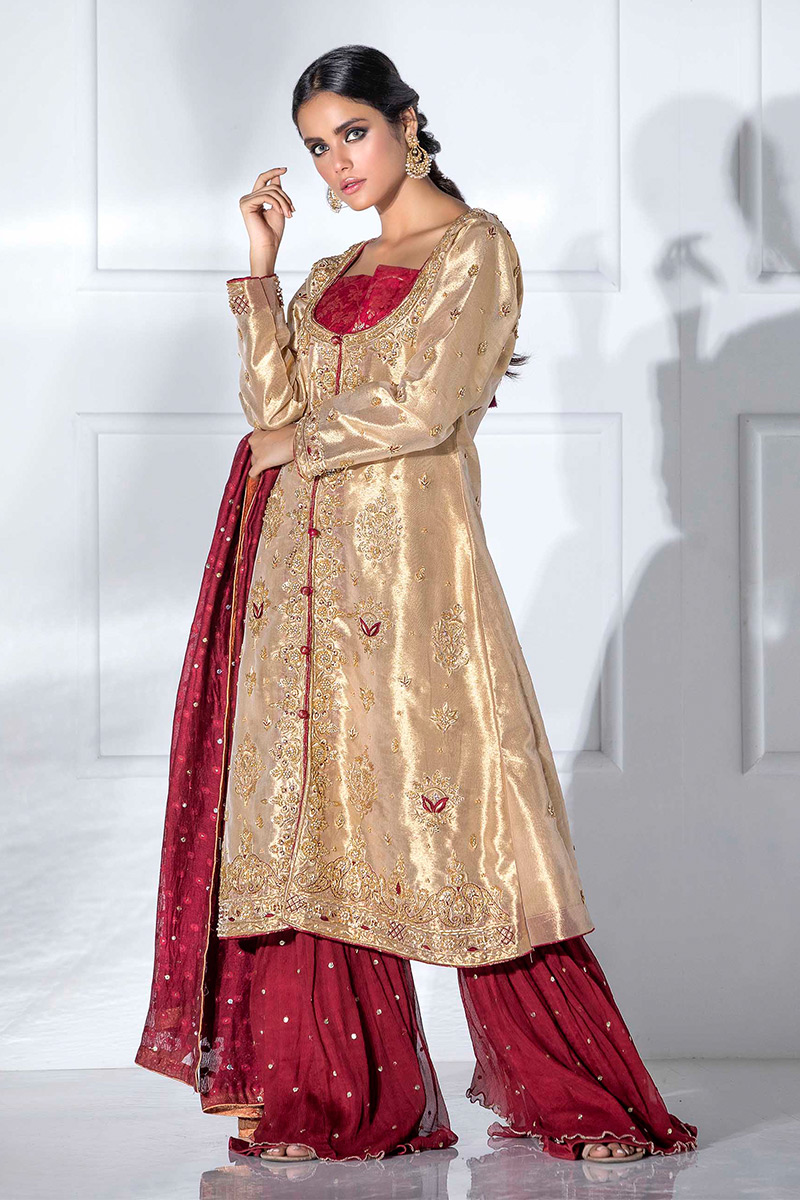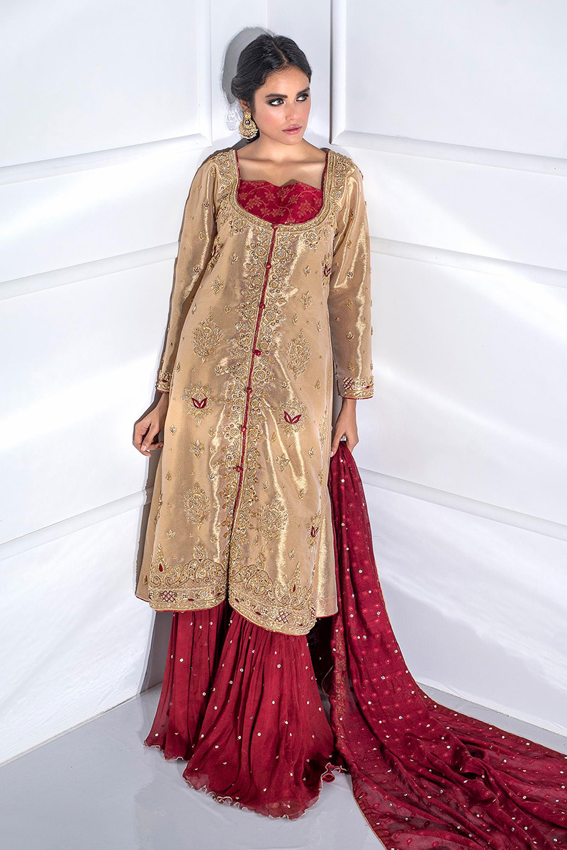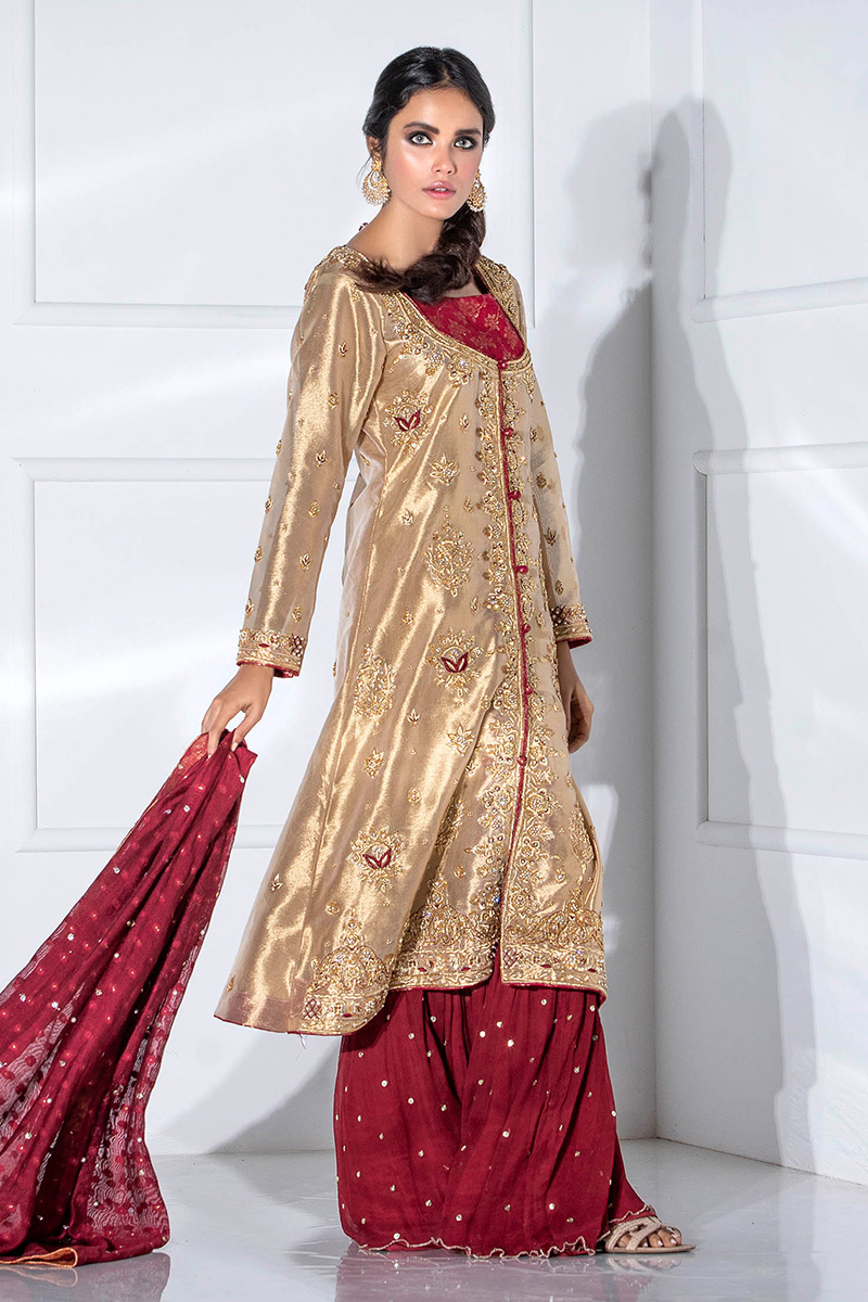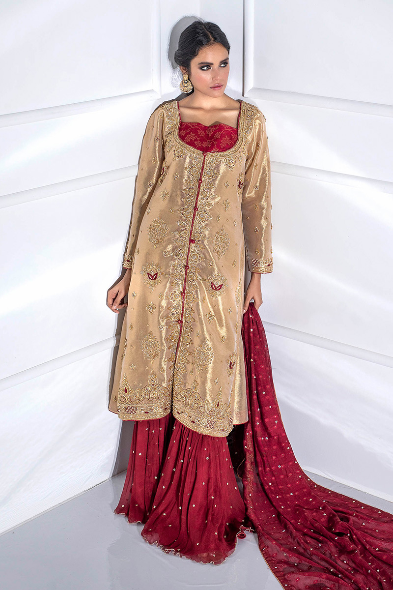 Traditional work on a classic silhouette, our shimmery tissue shirt is heavily embellished with gorgeous marodi work and beautiful resham detailing making it the perfect wedding ensemble. It comes with Chiffon gharara pants.