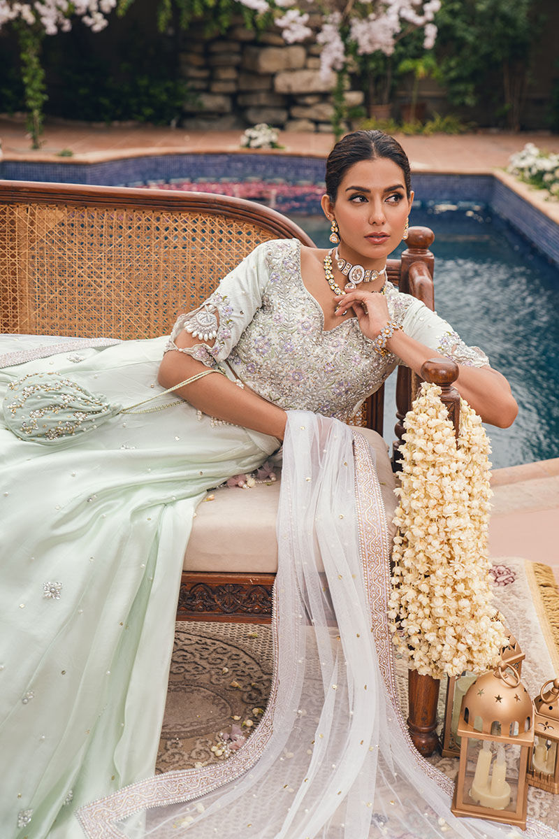The ensemble features a mint raw silk choli with intricate work, paired with a lehenga infused with handwork detailing. Completing the look is a net organza dupatta adorned with sequins, adding an elegant touch to the overall outfit.
