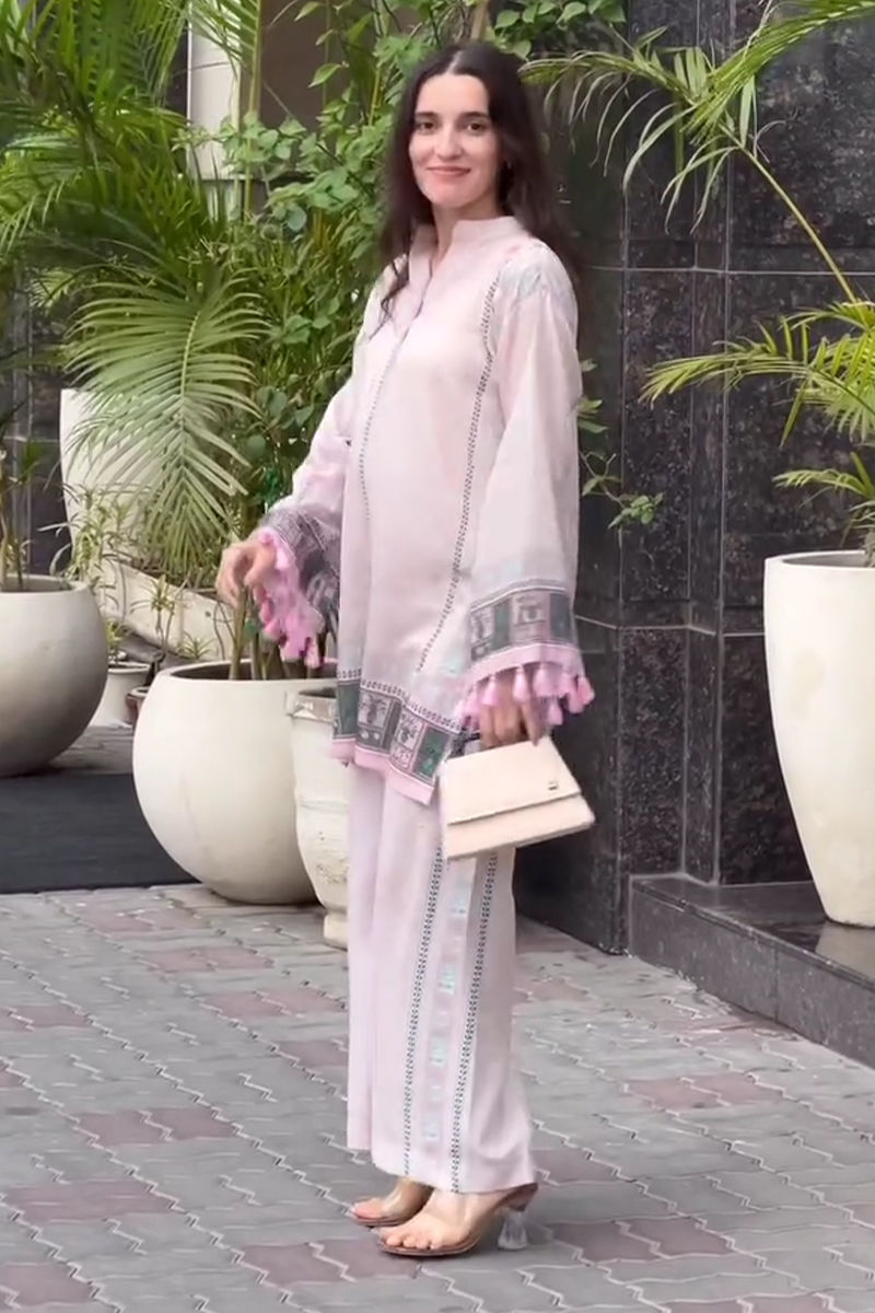 Elevate your everyday style with this breezy swiss lawn co-ord set, featuring a muted pale pink base and adorned with dark green, pale blue and beige accents. This is a straight-cut short kurta that is designed with flared bell sleeves finished with delicate pink tassels for a touch of feminine charm, It is paired with matching wide-leg trousers that carry the same subtle print and border detailing and a optional similary printed light and breezy silk scarf, creating a cohesive and effortlessly chic look making it perfect for casual gatherings, office wear, or summer outings, offering a blend of traditional grace and modern minimalism