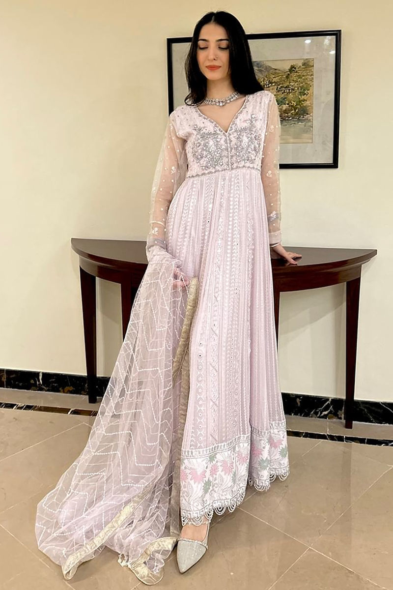 Elegance is timeless. The lilac kalidar shirt, adorned with lacy panels, intricate embroidery, and embellished details, exudes a sense of softness and femininity. Paired with an elegant net dupatta, Esra is the perfect blend of style and comfort.