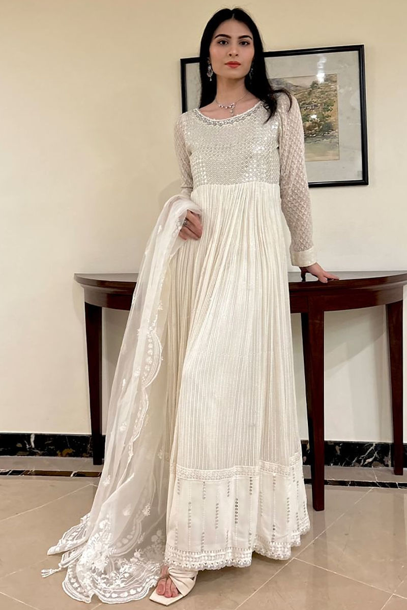 Color: White Fabric: Shirt: Chiffon, Pant: Silk Work Details: Embroidery, Lace and Hand Embellishment