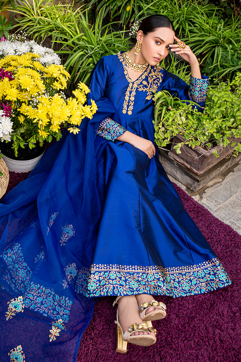 A bold ink blue silk pishwas is rendered in glowing tilla, dabka and resham work with contrasting blocked hemline. Can be paired with a screenprinted organza dupatta for an ethereal and incandescent ensemble that makes for an effortless formal look.