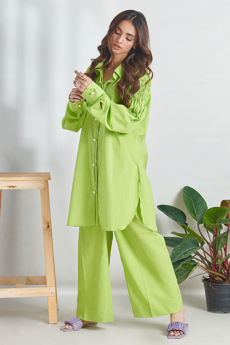 Summer evenings and soirees just got finer with our Apple green matching separates. A signature outfit with beautiful smoking detailing on the sleeves with contrasting buttons and matching pants.Includes Shirt and Trouser