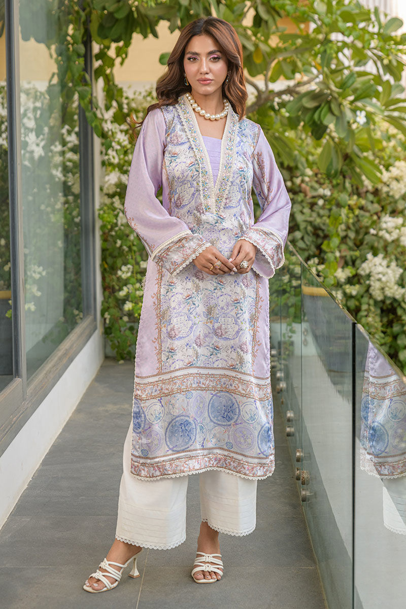 This beautiful article features a long A-line pastel blue, lilac and coral printed silk shirt with an embroidered, embellished and pleated neckline finished with lace details all paired with white culottes with pleats and lace details and a coral-lilac cotton silk dupatta