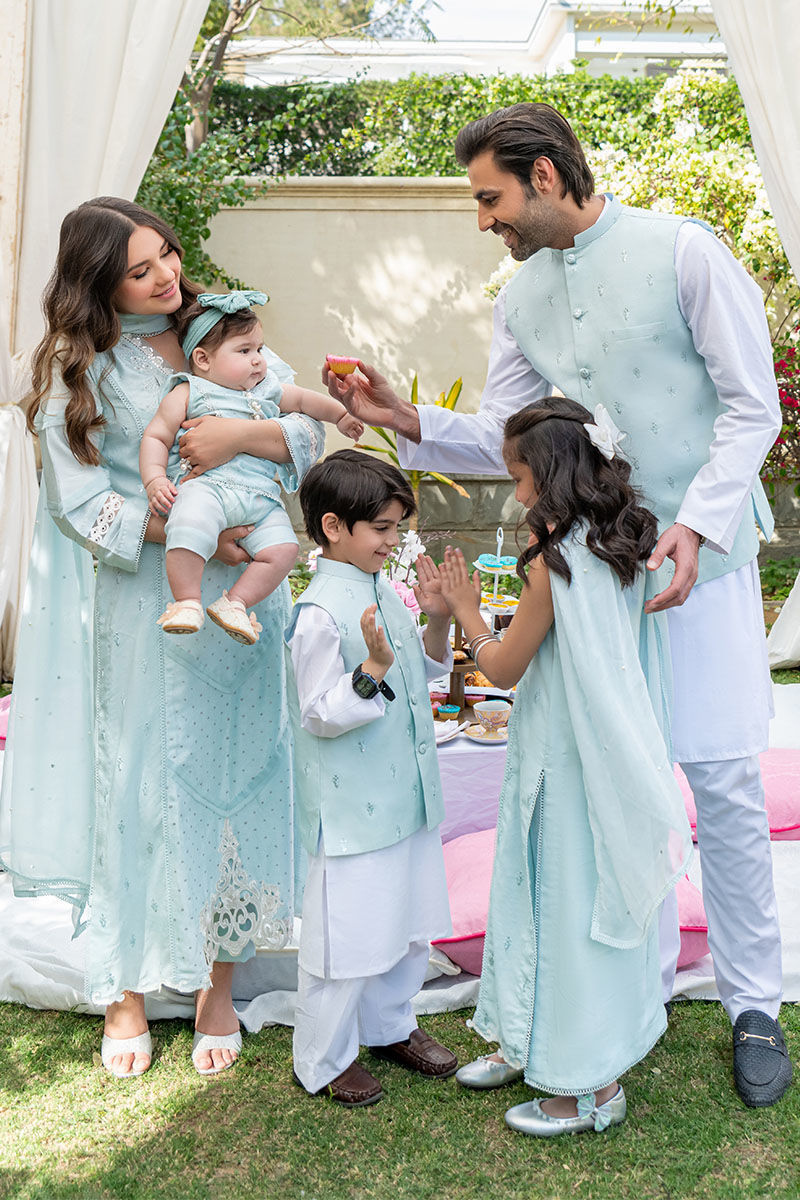 This modern article features a cotton silk three panel A-line shirt with an embroidered and embellished neckline, daaman and side panels all finished with block print and pleats details all paired with a straight pant and chiffon dupatta.
