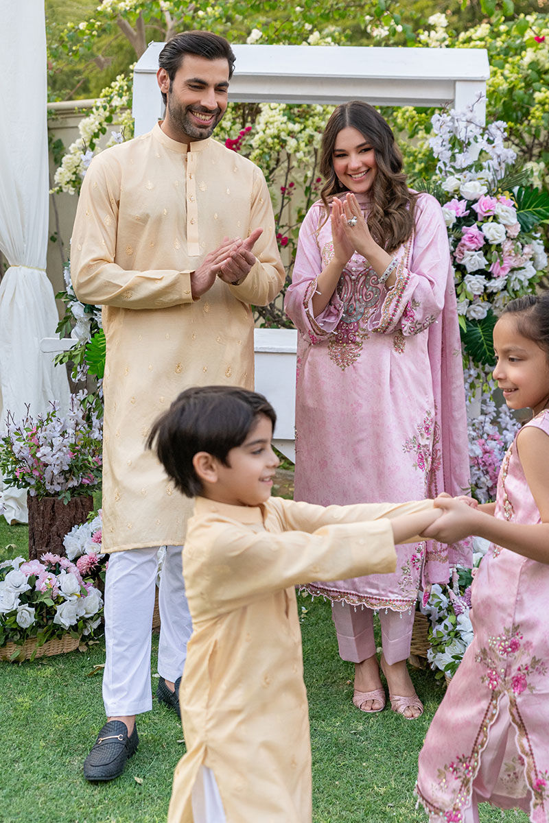 This article features a golden embroidered kurta with white straight paints
