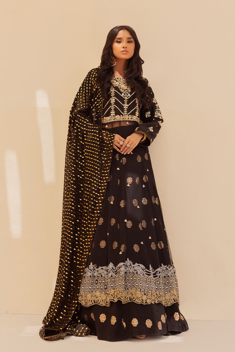Vivacious and Elegance. This flamboyant pishwas features silver and gold zardozi work over its awe inspiring bodice. The handworked arms of this piece add to its opulence. It can be paired up with a delicately sequins embellished dupatta.