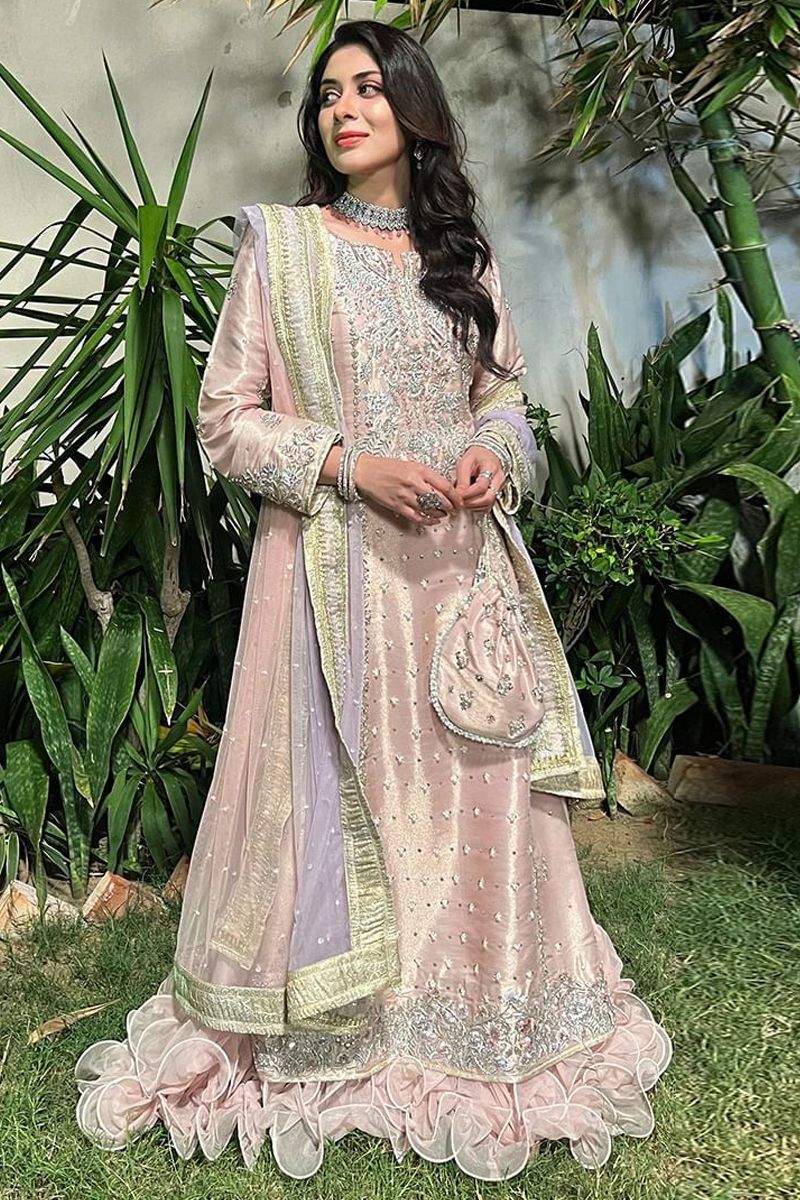 The ensemble features a delicate pink lamé shirt adorned with intricate embroidery and pearl details throughout. The handwork detailing on the neckline, sleeves, and hemline enhances the grace of the outfit. It is elegantly paired with a tissue ruffled skirt and a sheer net dupatta, creating a sophisticated and enchanting look.