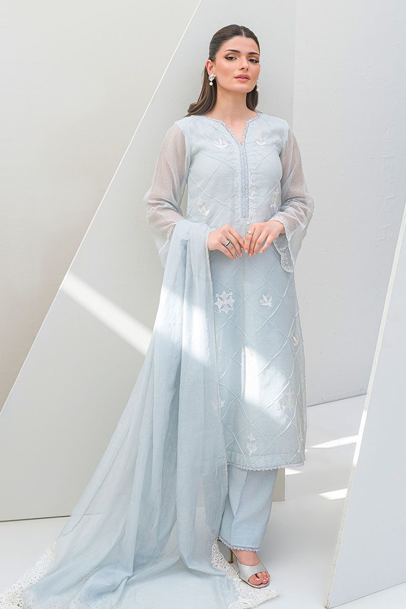 Delicate and dreamy, Azure Frost showcases a powder blue khaadi net long shirt with refined pintuck detailing and soft white embroidery, all elegantly finished with lace accents. The ensemble is paired with coordinating cotton silk culotte pants and a matching organza dupatta adorned with intricate white cutwork embroidery—offering a serene, sophisticated charm.