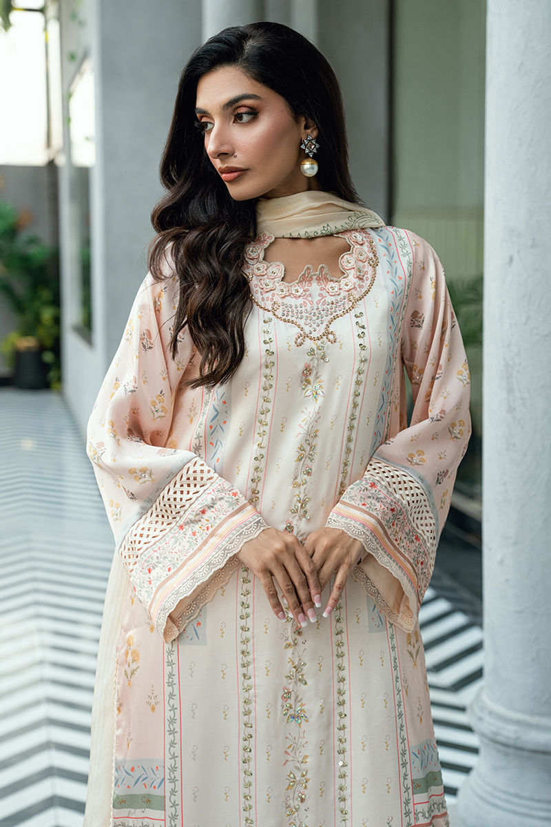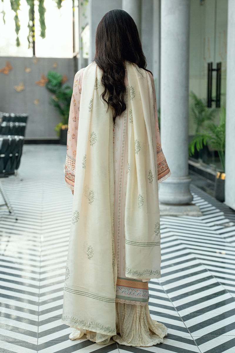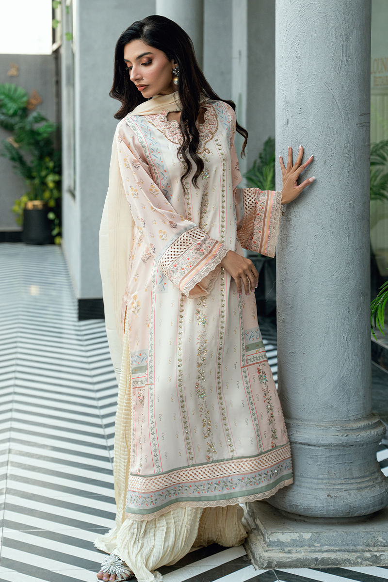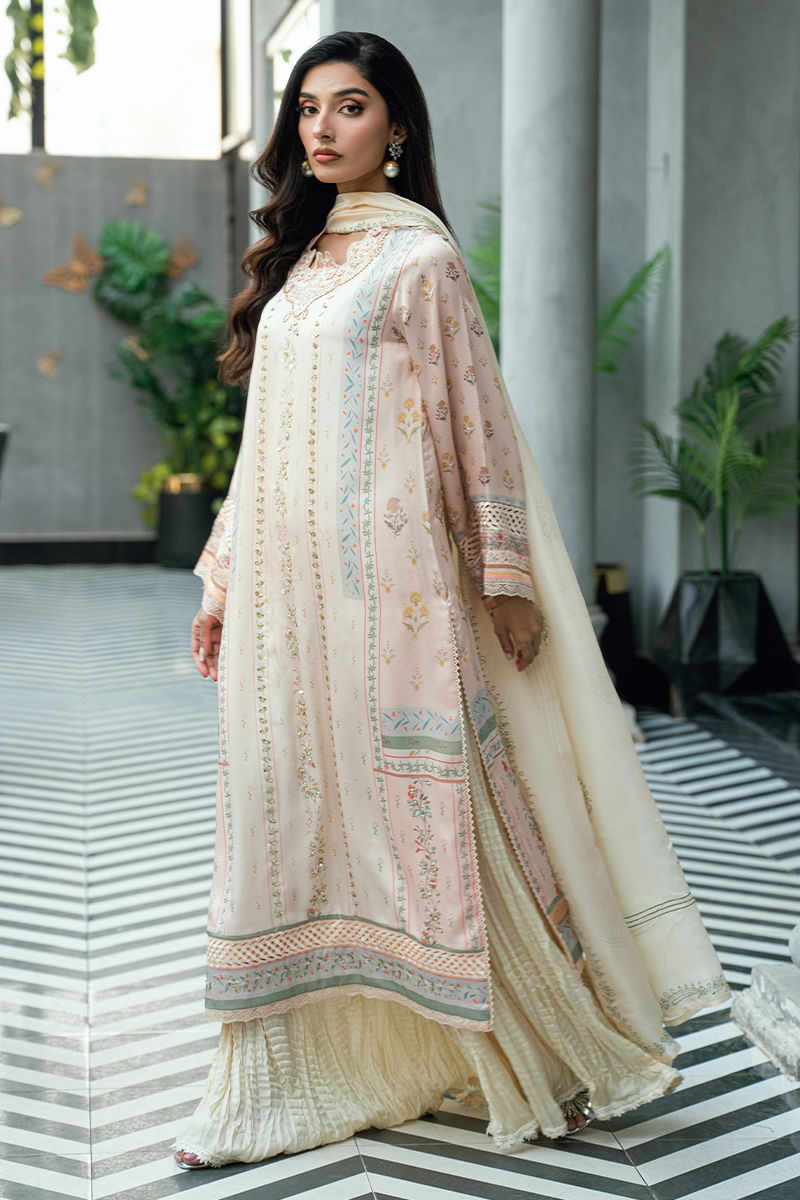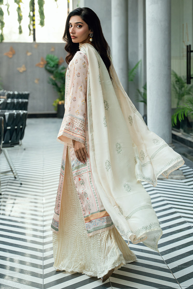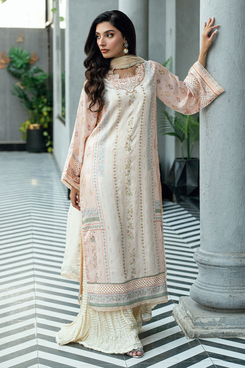 Paired with a matching digitally printed dupatta that complements the pastel palette and flowing crushed sharara pants in a coordinated ivory tone, this ensemble offers elegant movement and timeless appeal. Ideal for festive occasions, Eid celebrations, and sophisticated daytime events.