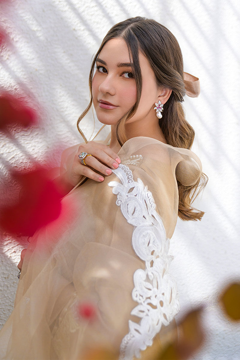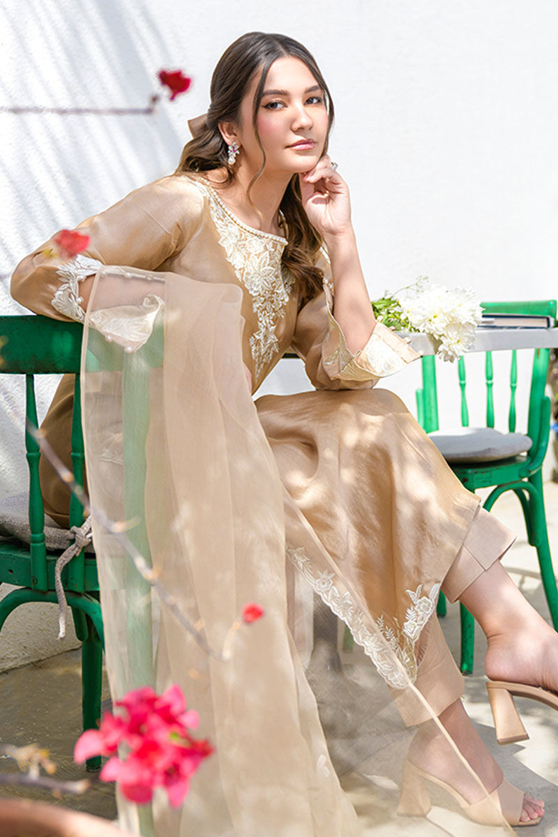This sophisticated article features and beige colored long shirt in pure sheesha silk with an embroidered neckline and borders finished with cutwork and loops and pearls details all finished with cotton silk straight pants and a pure organza dupatta with embroidered cutowork