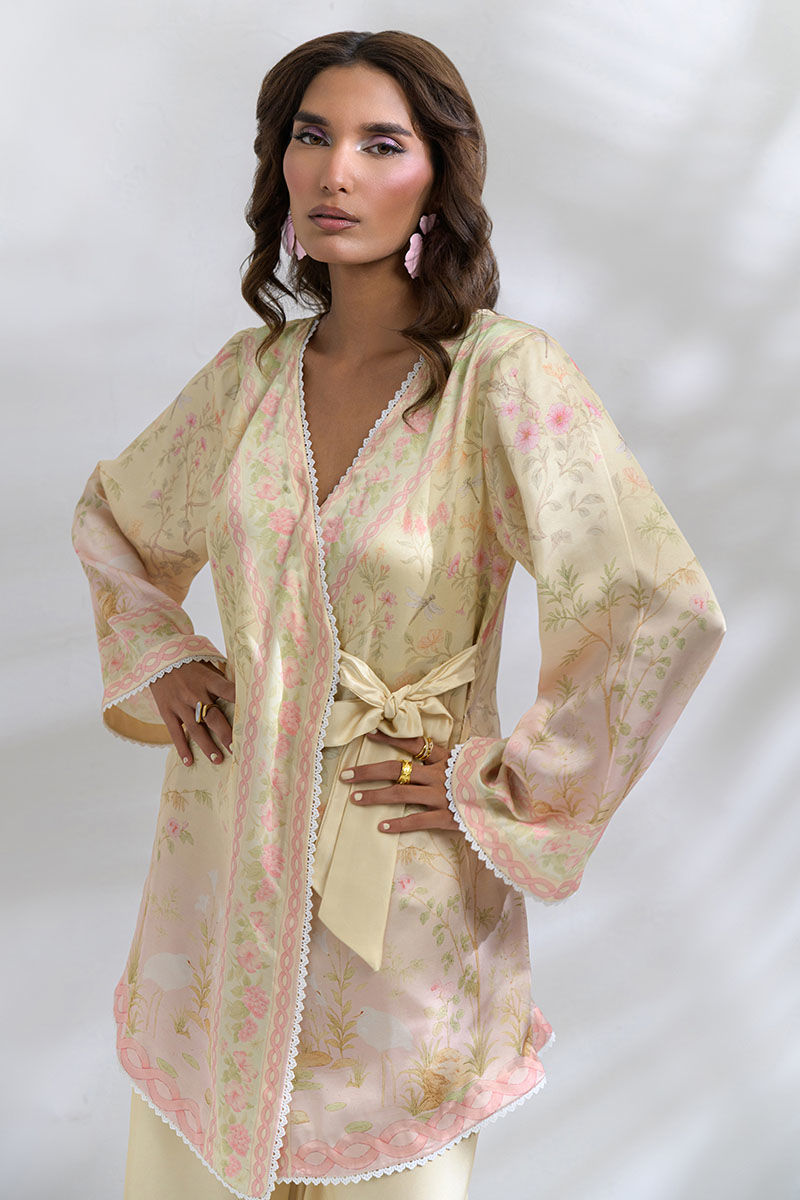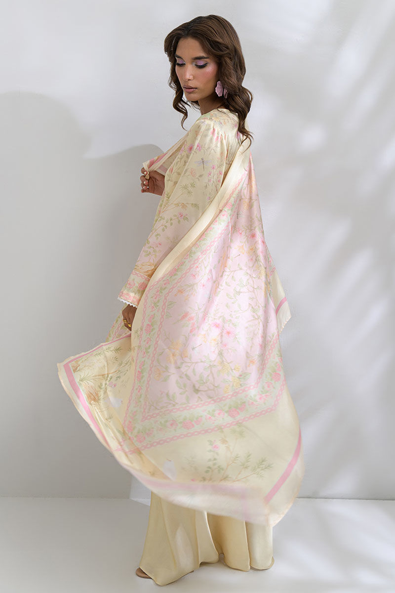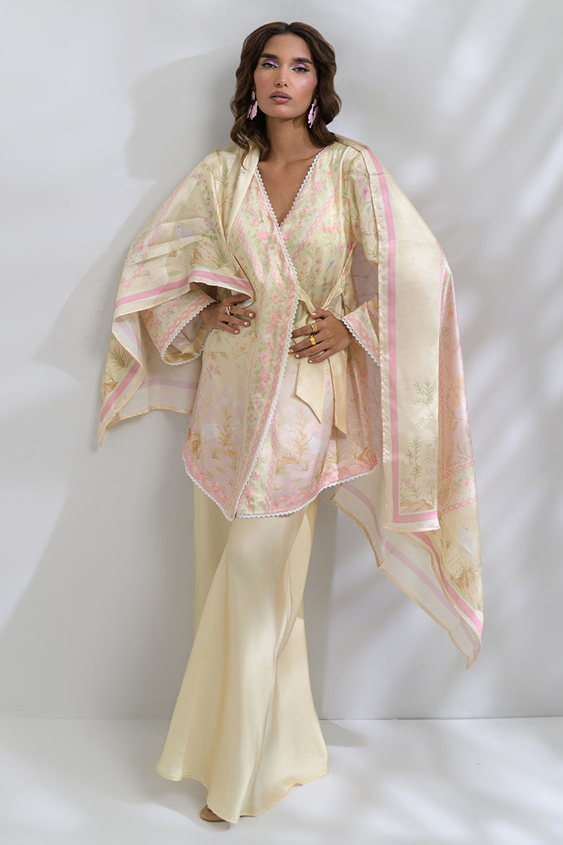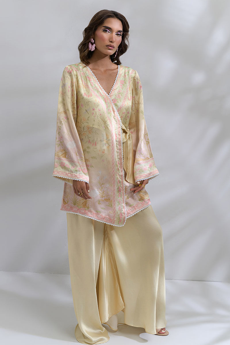 Step into calm luxury and feminine softness with this shamooz silk coord set that features butter-yellow and blush color palette. This is a wrap-style kurta that features wide sleeves and delicate edging and an overall unique cut, paired with flowing palazzo pants in matching butter tones and a similarly printed scarf making it perfect for festive brunches, bridal showers, or an elegant summer evening