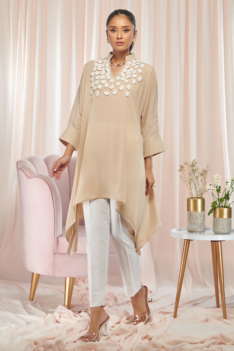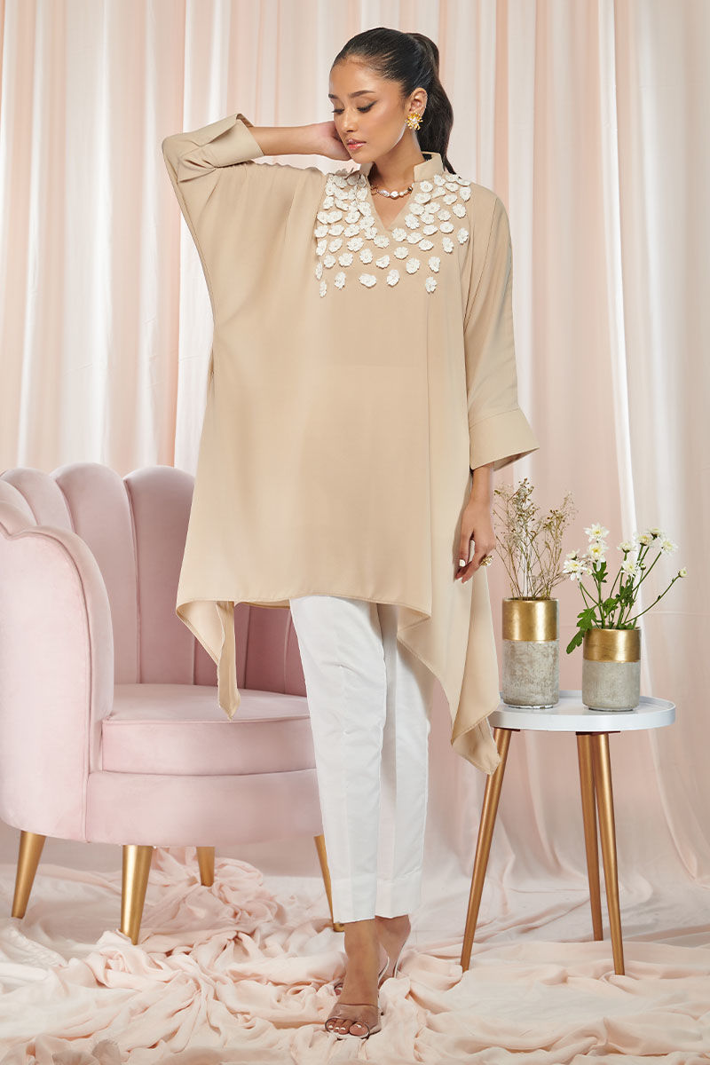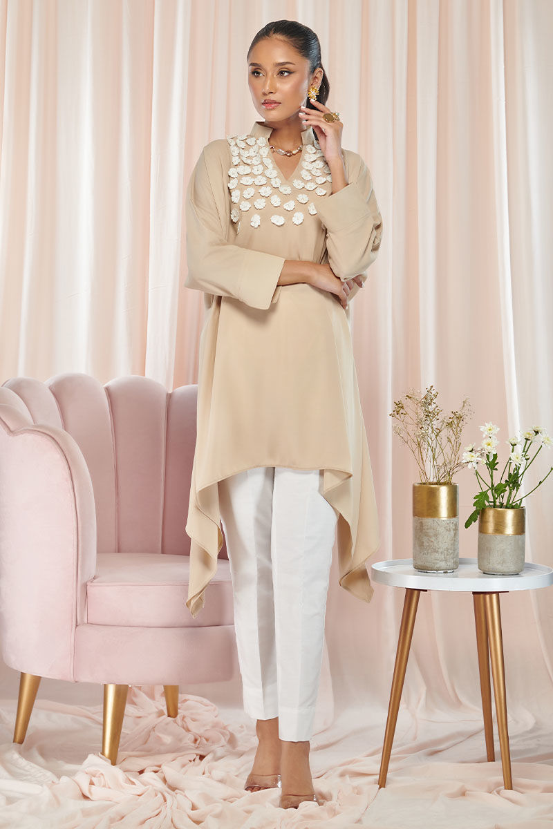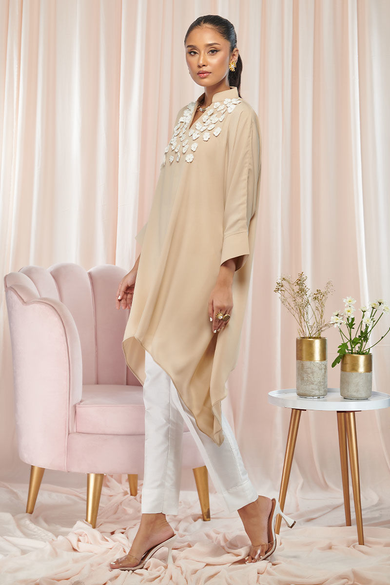 Indulge in the beauty of this georgette kimono adorned with 3D flowers made of lace, creating a whimsical and enchanting look. The kimono’s flowy and lightweight fabric adds an air of elegance, making it a perfect choice for various occasions. The intricate lace flowers add depth and texture to the outfit, showcasing exquisite craftsmanship. Paired with straight pants, this ensemble offers a harmonious and stylish look.