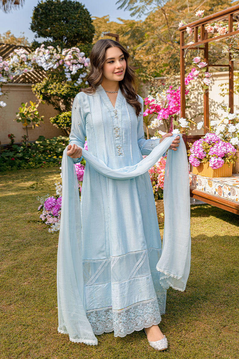 Dreamy pastels meet timeless elegance in our pure khadi net kalidar. Intricate embroidery on the neckline and daman, paired with straight pants and a laced-trimmed chiffon dupatta, create a truly stylish and sophisticated ensemble