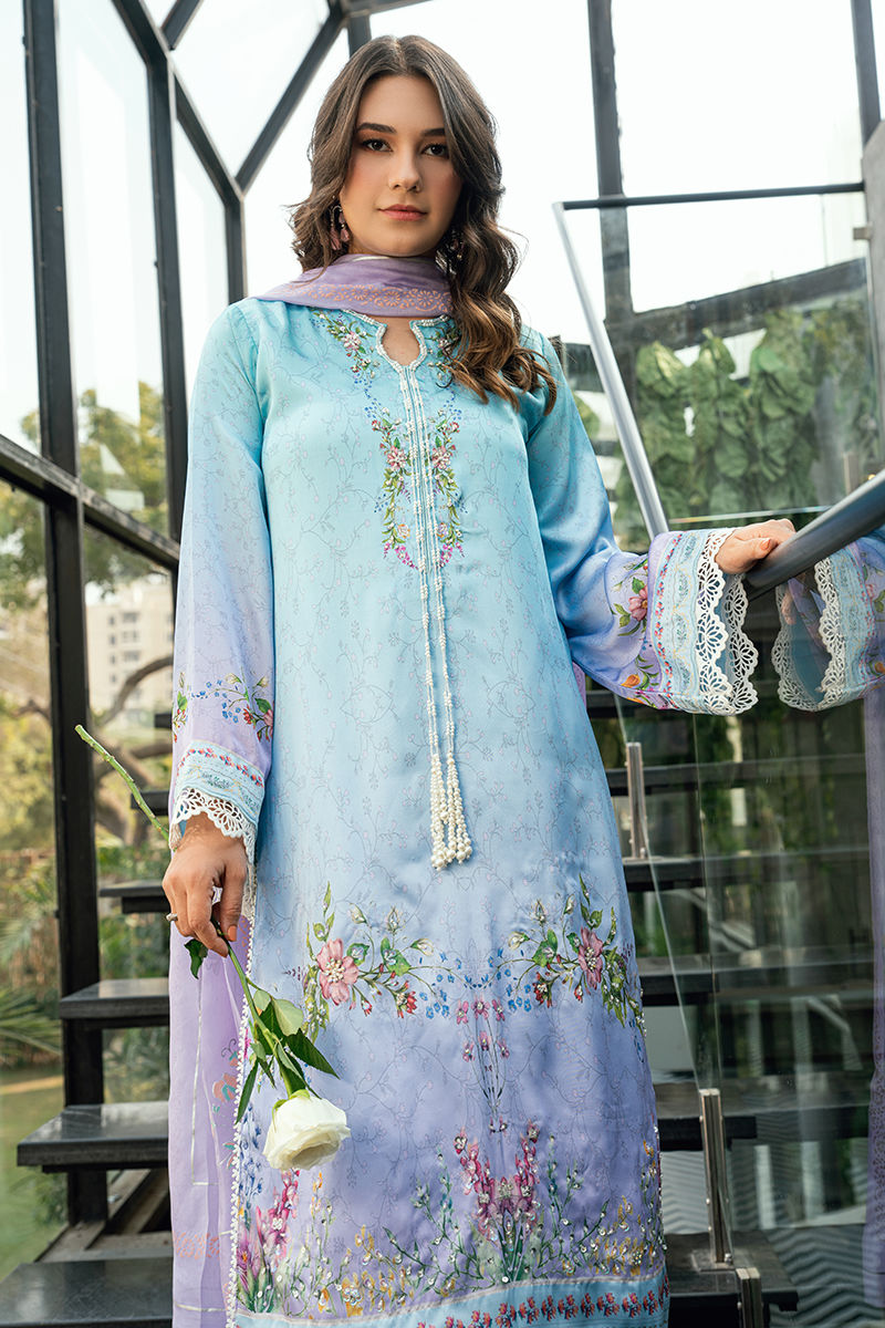 This refined three-piece ensemble features a soft sky-blue long shirt adorned with delicate digital prints inspired by floral and ornamental motifs. The front is beautifully highlighted with hand embellishments and subtle embroidery, adding a graceful sparkle and artisanal depth to the design. Intricate lace detailing at the sleeves and hem enhances the shirt’s elegant finish.