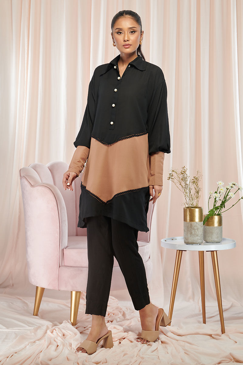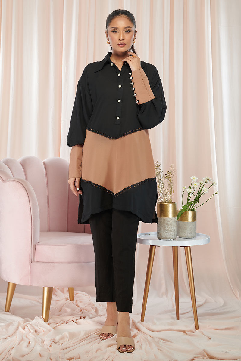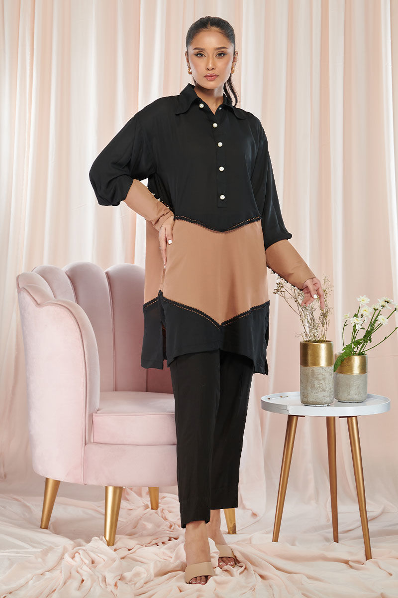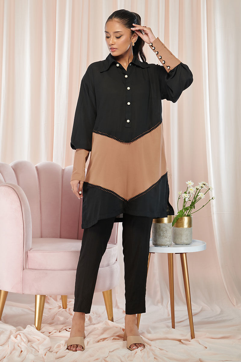 Step into chic sophistication with this two-piece ensemble featuring a black and brown horizontally paneled shirt, accentuated with delicate lace detailing. The unique panel design adds a touch of modern elegance to the outfit, while the lace detailing enhances its overall charm. Paired with matching pants, this ensemble promises a cohesive and stylish look that’s perfect for various occasions.