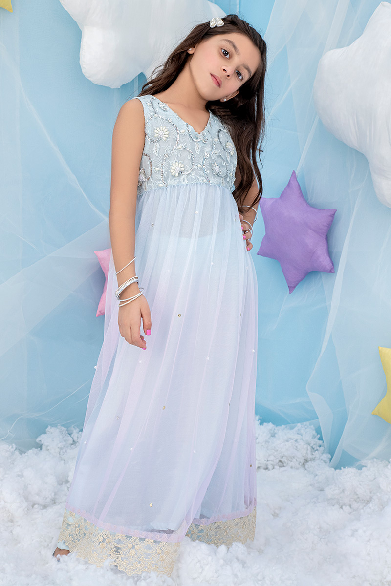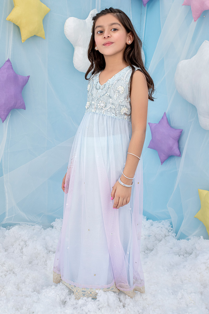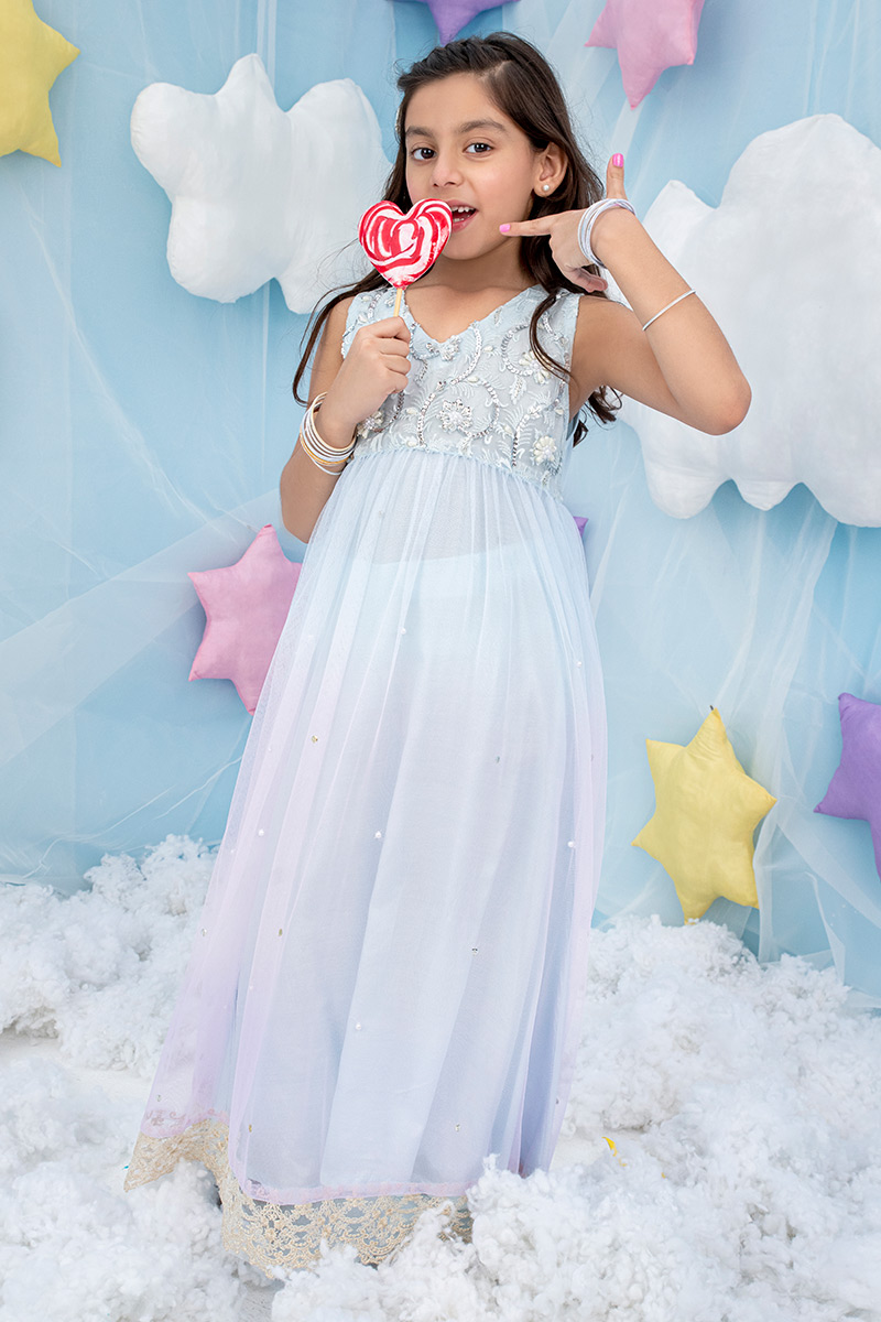 Color: Blue-Pink-Lilac Fabric: Net Work Details: Embroidered