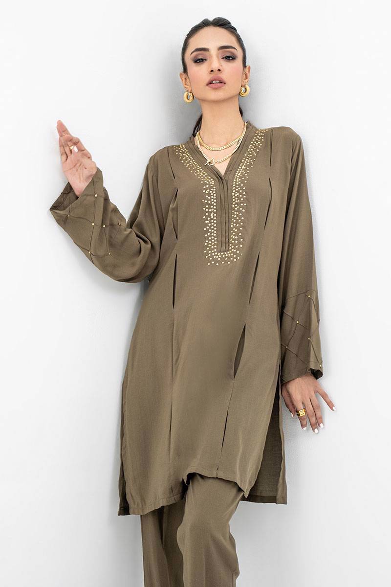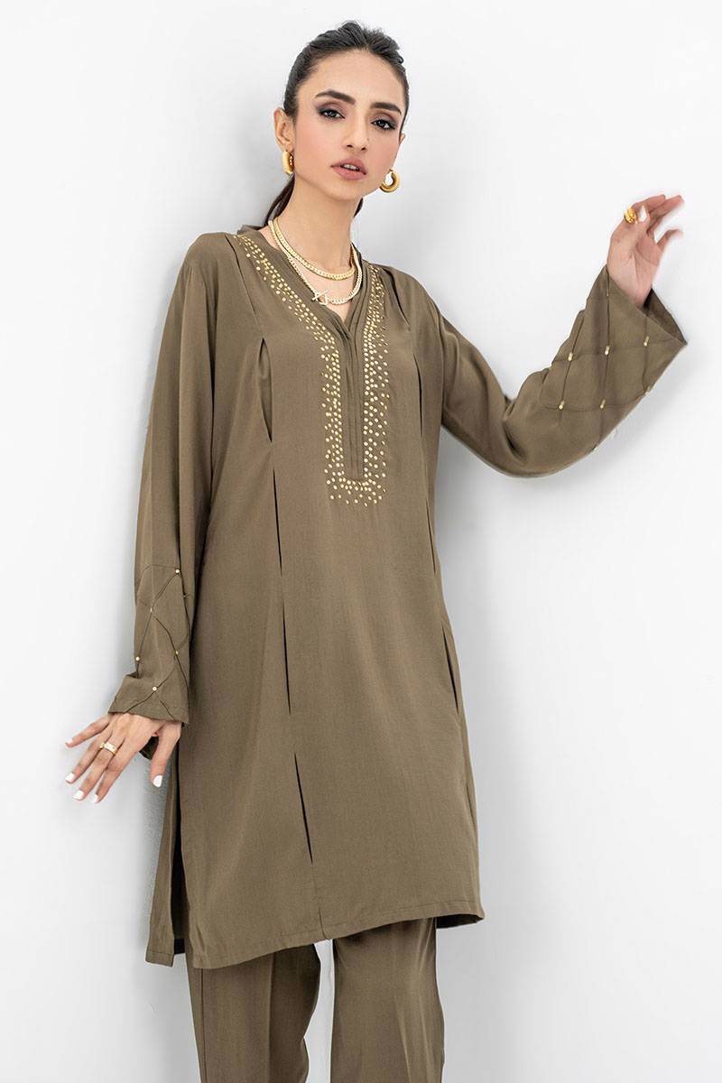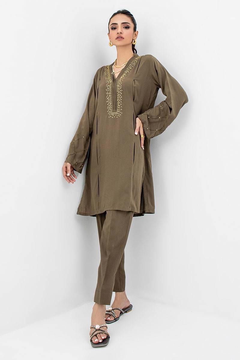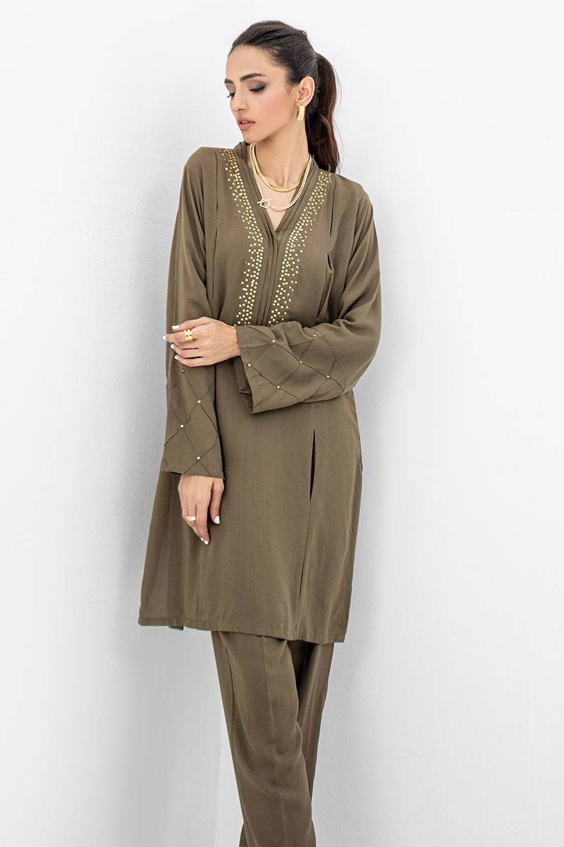 Color: Olive green Fabric: Butter Linen Work Details: Embellished