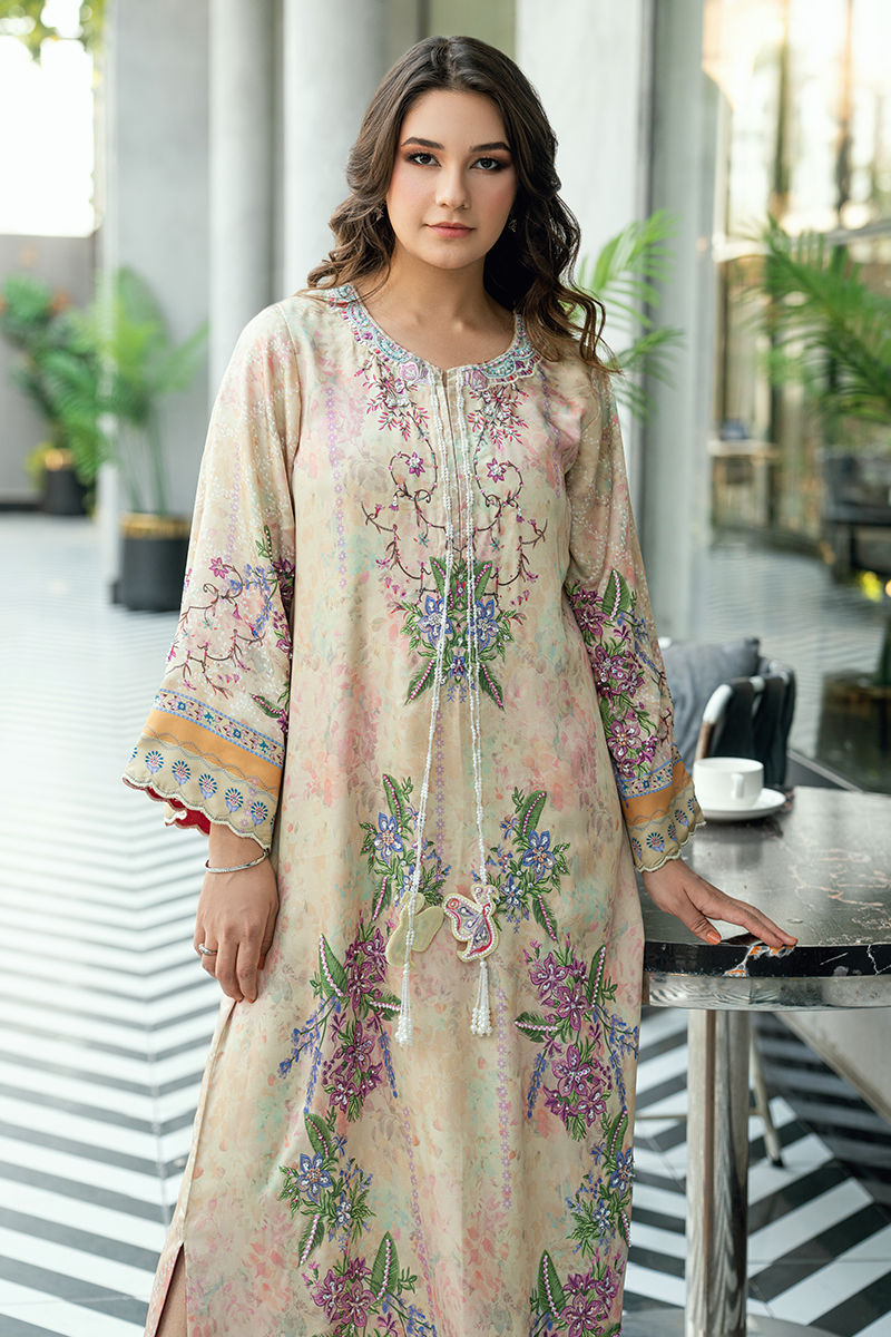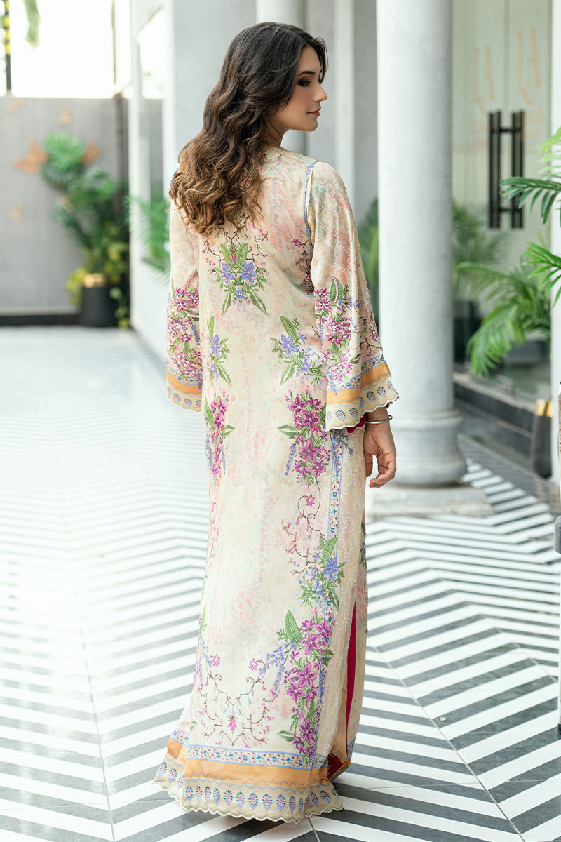 This graceful kaftan is designed on a soft beige–peach base, beautifully brought to life with a delicate digital floral print in harmonious shades of lavender, lilac, soft purple, blush pink, muted rose, sage green, and hints of soft blue. The color palette feels warm, romantic, and soothing—perfectly balanced for refined daywear.