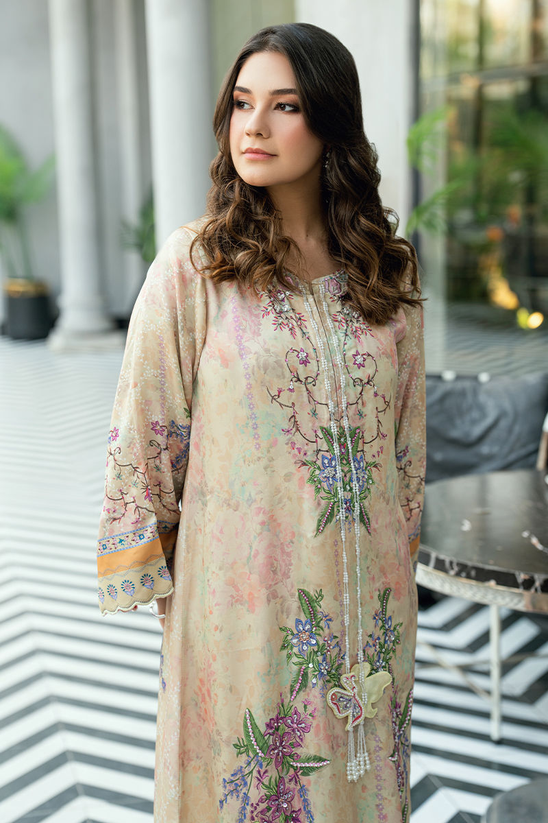 The neckline is the focal point, adorned with elegant embellishments and butterfly-shaped pearl tassels that add movement, charm, and a subtle touch of luxury. Fine embellishment details are thoughtfully placed across the front, enhancing the floral print without overwhelming the silhouette. The kaftan is finished with coordinated printed borders at the hem and sleeves in soft peach, pastel blue, and gentle gold accents, completing the look with polished finesse.