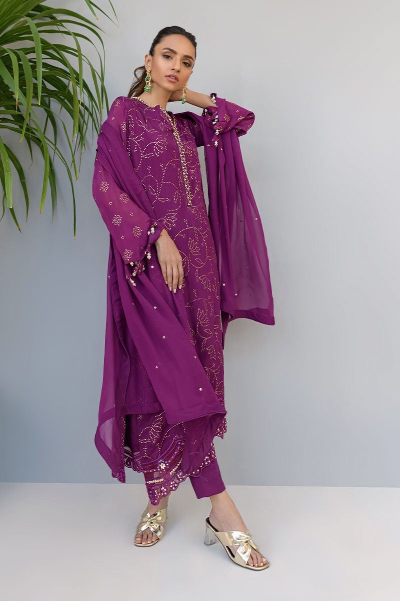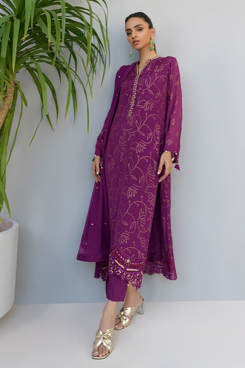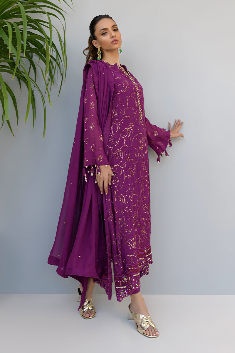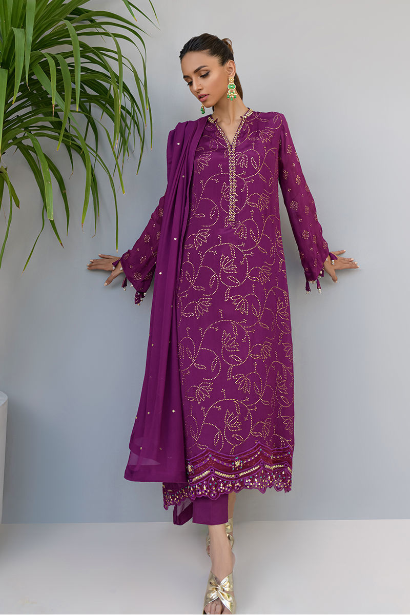 Color: Purple Fabric: Shirt:Khadi Chiffon, Pants: Silk