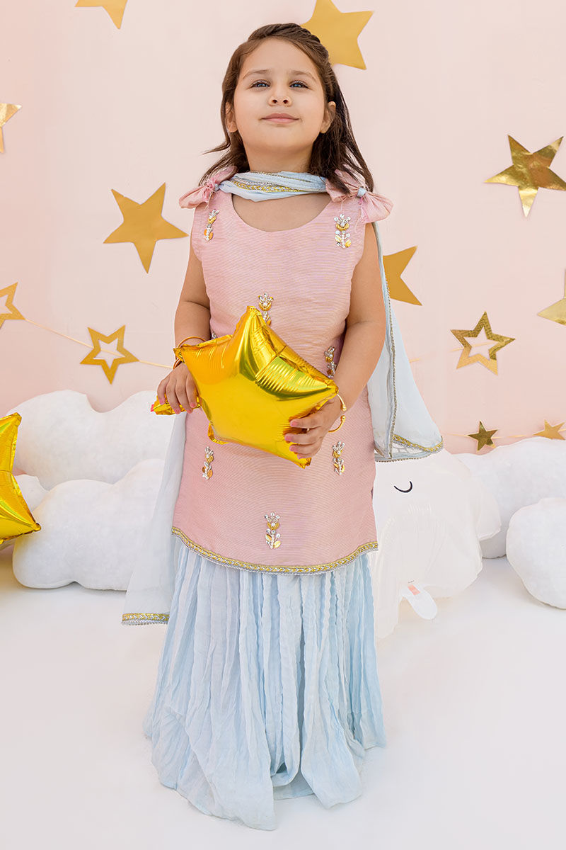 This candy pink kurta with lovely motifs all over, with cute little bows on the shoulder, and lace detailing on the daman is perfect to jazz up a festive look. Pair with trending crush lengha and a contrasting blue-hued dupatta