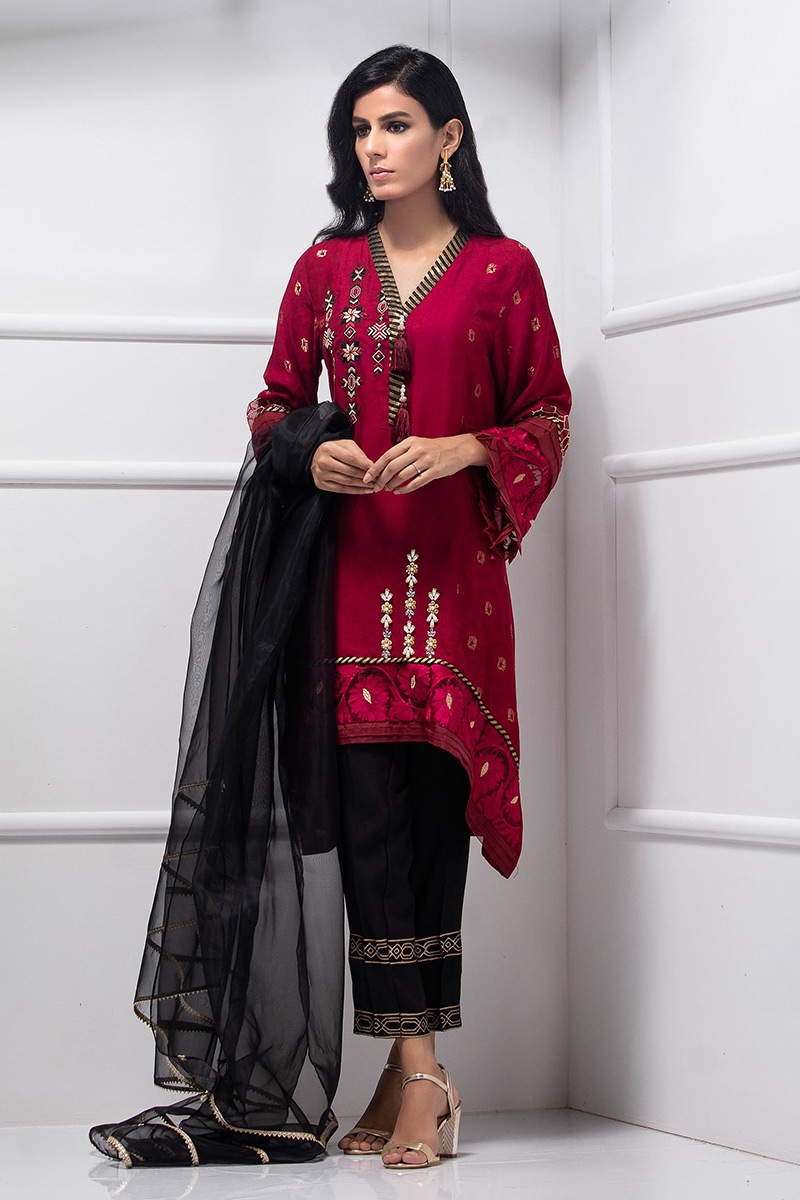 A- line Khaadi net shirt with pearls and sequins hand work details .The resham embroidered detailing over the shirt neckline adds grace to this design. Comes with this trendy block printed pants to complete the look.