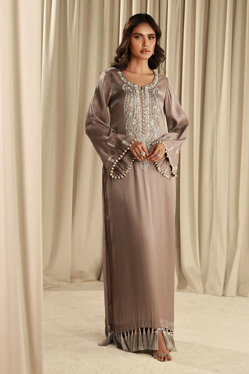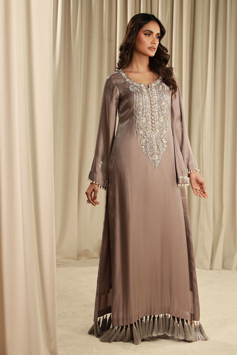 This amazing grey shimmer silk long shirt which is beautifully embellished with pearls and gems and a fully tasseled daaman finished with cotton silk pants.