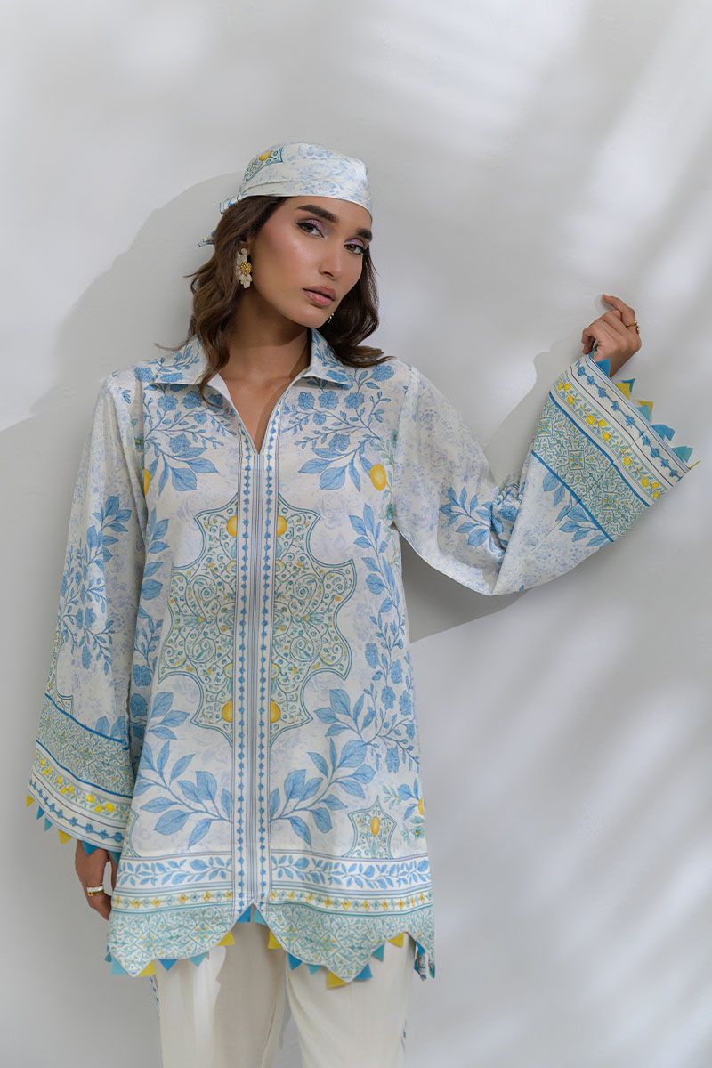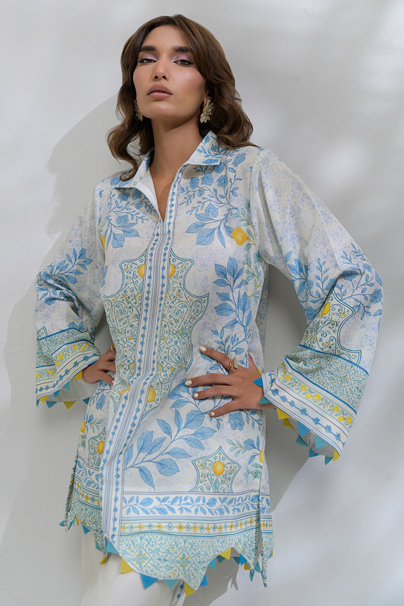 Elevate your wardrobe with this breezy and refreshing Swiss lawn co-ord set that features a blue and lemon-yellow color palette that adds a citrusy lift to the off-white base. A loose, straight kurta with a scalloped hem and fabric manipulation detaliling effortlessly pairs with tapered ivory pants detailed with matching motifs. This outfit is Ideal for a seaside lunch or a serene day out.