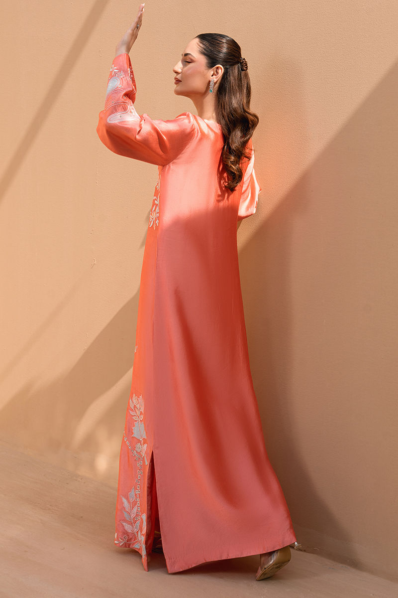 Radiating warmth and femininity, this coral-hued long silhouette is a graceful blend of ease and elegance. Crafted in a fluid fabric, the outfit features delicate ivory floral embroidery sweeping across the neckline, sleeves, and hem, creating a harmonious balance of detail and simplicity. The relaxed fall of the silhouette enhances movement, while the subtle craftsmanship lends a refined, timeless appeal. Ideal for daytime festivities, intimate gatherings, or festive brunches, this ensemble captures the essence of modern floral charm.