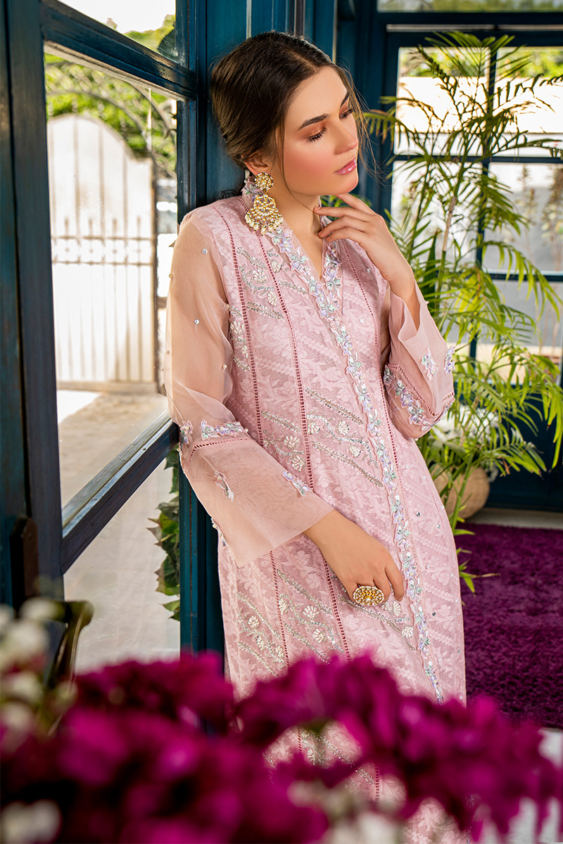 A straight breezy pink shirt with worked stripes on one side and pearls detailing on the other side and sleeves gives a delicate feel. It is paired with straight trousers