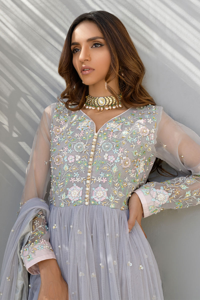 Grey pishwas adorned with resham florals embellished using zardozi, dapka abd 3d flowers