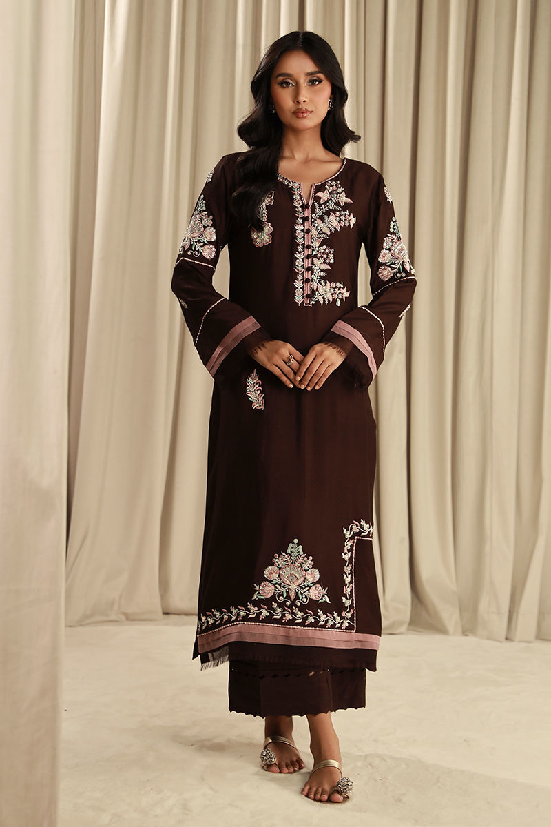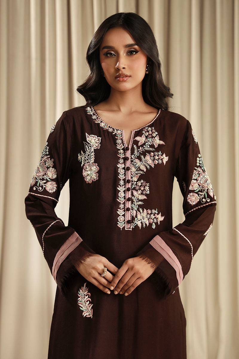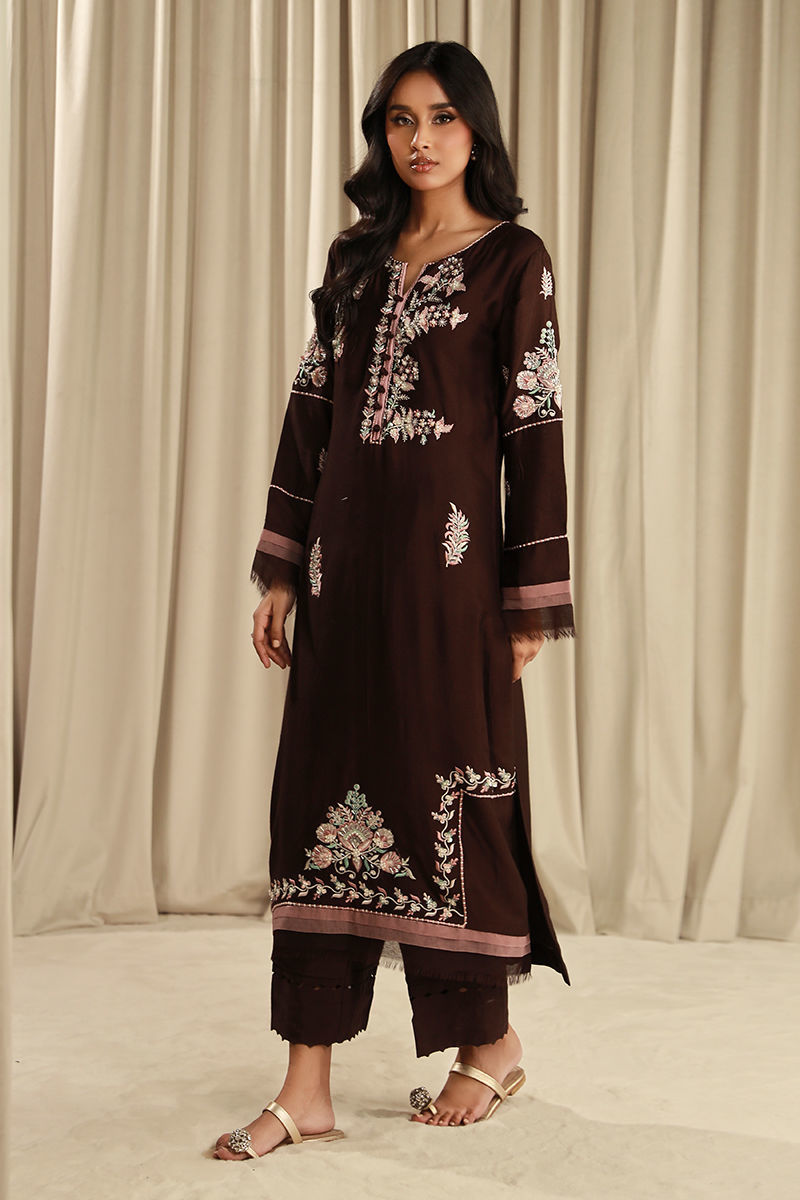 This eclectic article features a dark brown khaadi net shirt with pastel embroidery and silver embellishments with raw edge details and beautiful cotton silk wide-legged trousers finished with a block-printed dupatta.