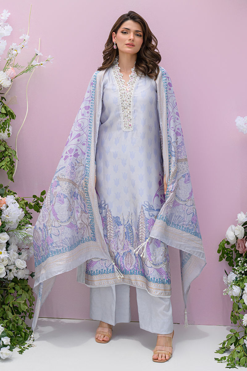 This gorgeous article features a periwinkled colored digital printed long shirt. The neckline is intricately embroidered and embellished, while the daman is also beautifully adorned. Lace detailing adds a refined finish to the design. The ensemble is paired with similarly colored culottes and a matching digital printed dupatta, elegantly finished with tassels.
