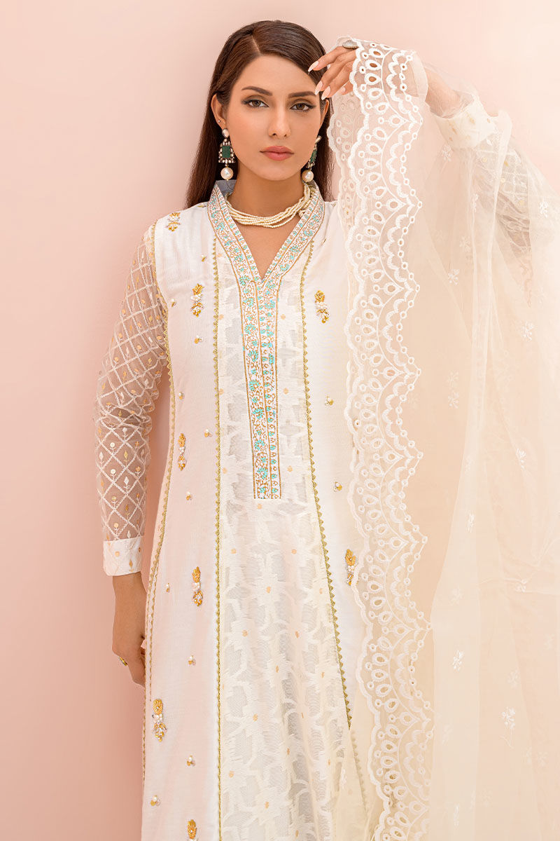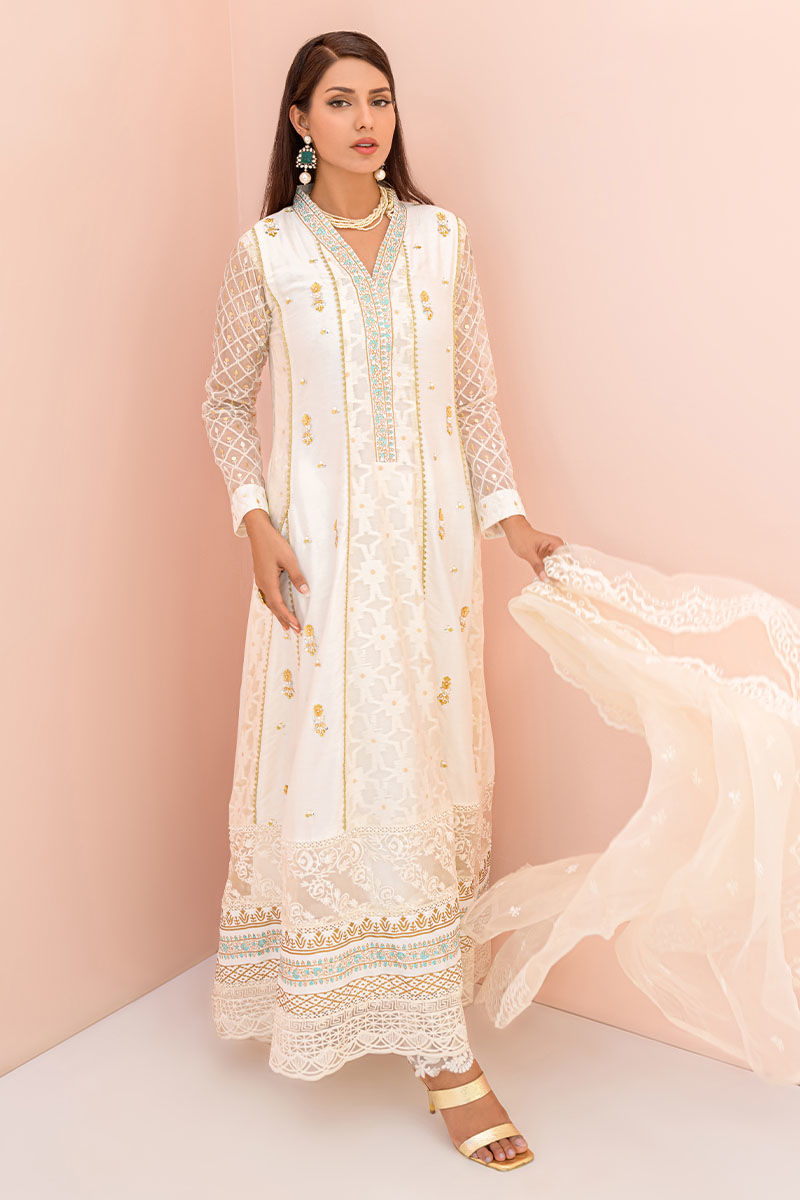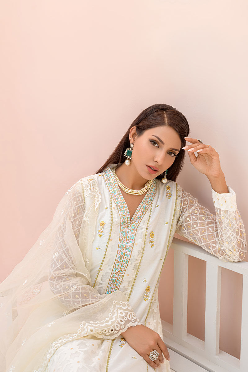 This excitingly designed off-white kalidar is perfect for various occasions it is furthermore enhanced with intricate hand embroideries and a blockprinted neck and hemline.