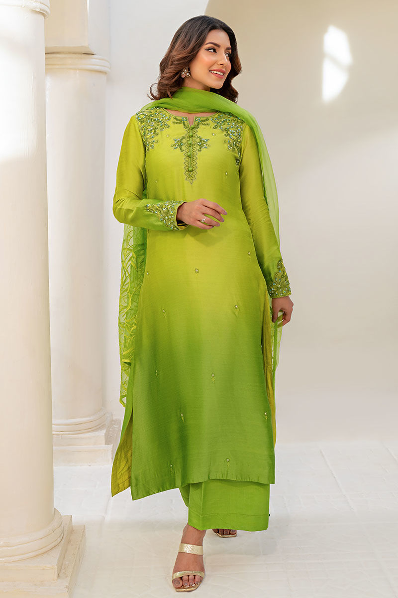 The distinctive blend of two spring-inspired green shades enhances this exquisite ensemble. The two-tone raw silk shirt, adorned with intricate embroidery and a hand-embellished neckline featuring pearls, sequins, and delicate handwork, exudes sophistication. Paired with loose pants and a pure organza embroidered dupatta adorned with crystal tassels, the outfit radiates elegance and charm, perfect for any spring occasion.