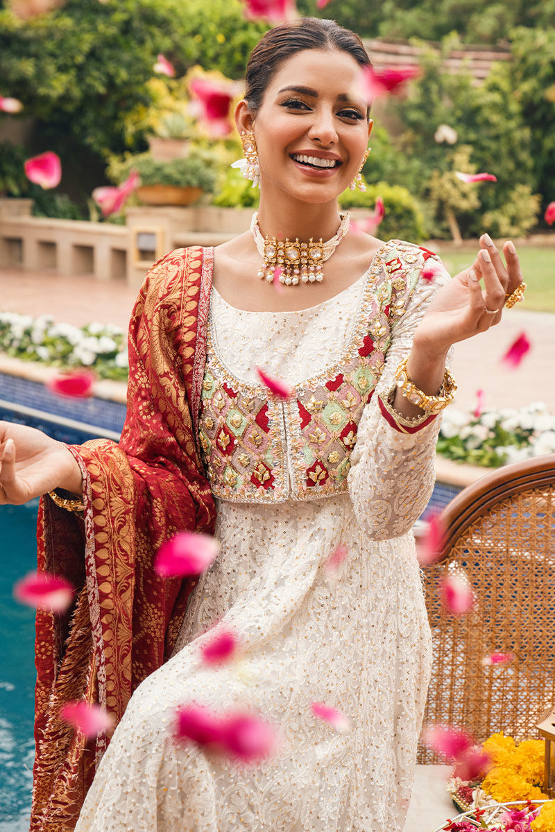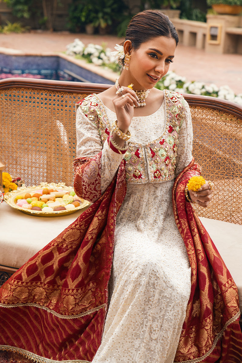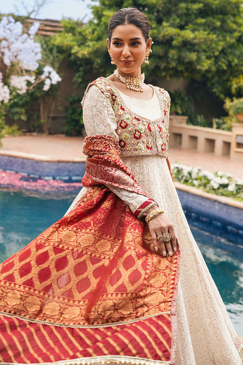 Long and flared silhouette sand beige angharka pishwas with subtle embroidered details that are enhanced with dabka and single thread embroidered details. The net pishwas is adorned with sequins and pearls on the front and back which is finished with hand block-printed border. The zari chiffon dupatta with details incorporated with sequins completes the look. The pishwas can be paired with straight silk pants.