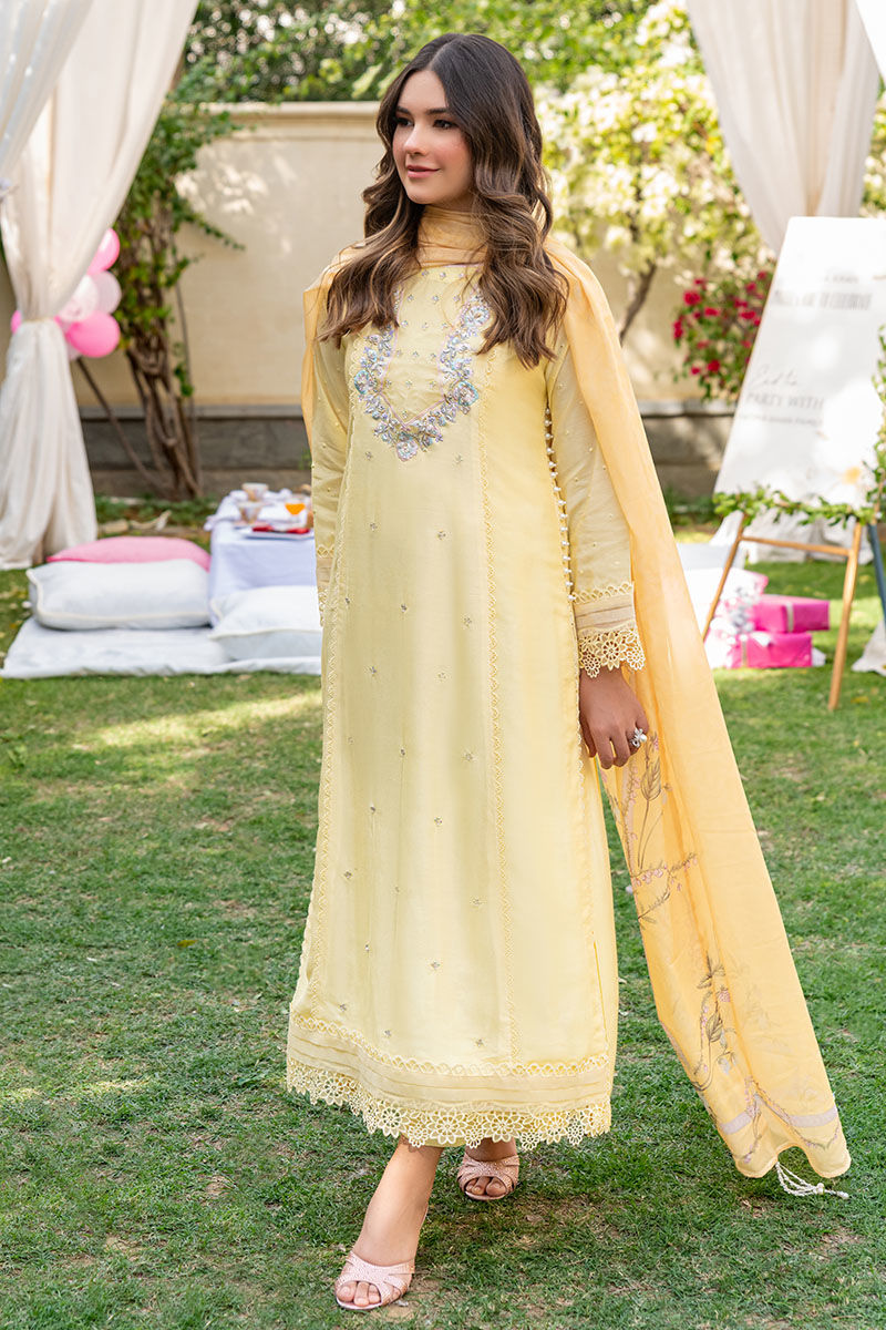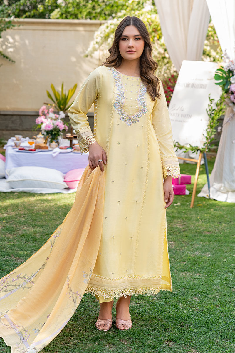 This beautiful articles features a yellow three panel A-line khaadi net shirt with an embroidered and embellished pastel neckline and embellished panels all finished with pleats, pearls and laces all paired with a digital printed dupatta with tassels and a cotton silk straight pants.