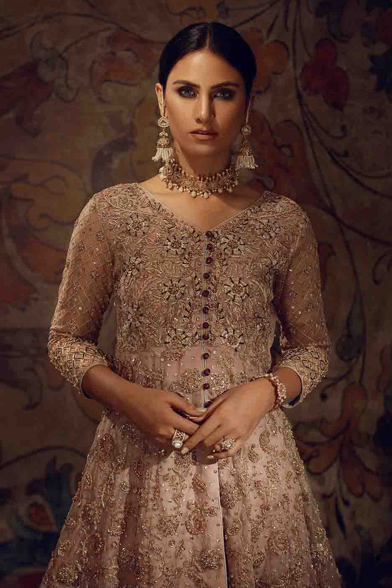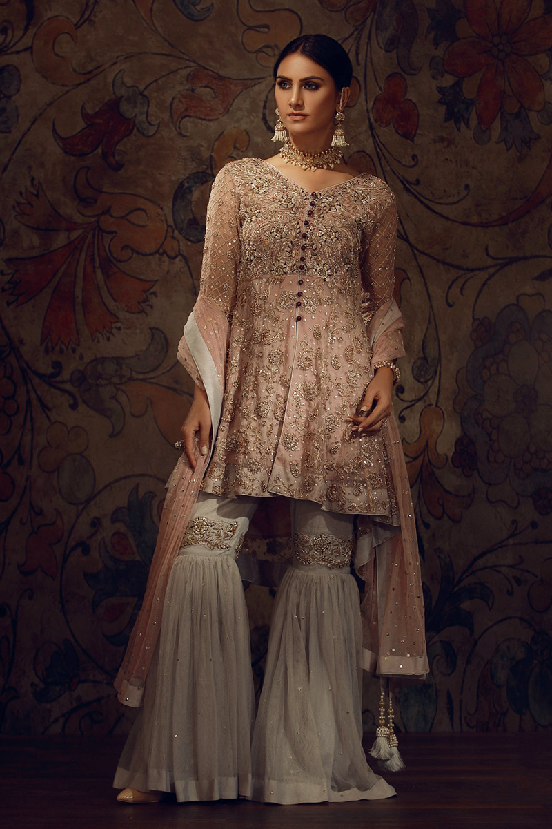 This pastel pink ensemble with a grey net gharara and dupatta is absolutely stunning. The intricate handwork of kora, dabka, and threadwork, combined with resham zari details, creates a perfect balance between tradition and contemporary style.