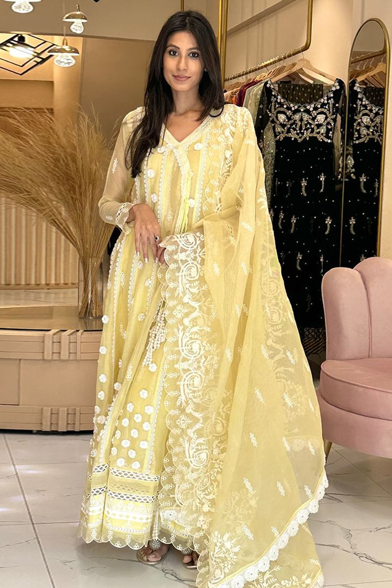 Pastel yellow angharka on embroidered karandi with intricate embroidered 3d flowers. Over the shirt and a beautiful handmade tassel, hemmed with block printed border and laces. It can be paired with an organza scalloped dupatta, edged with pearl tassels and straight pants.