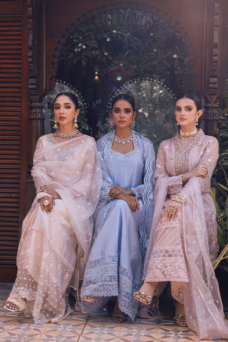 Designed for a delightful day,this pale pink high low ensemble combines grace and comfort. The flared shirt enhanced with delicate hand embellished neckline adding whimsy and grace.