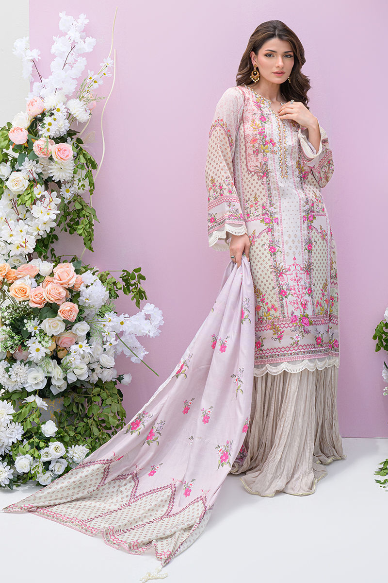 This beautiful ensemble features a digital printed shirt with and embellished neckline and print-embellished flowers adorned with embroidered cut-work borders and sleeves all paired with a cotton silk crushed skirt and a digital printed silk dupatta.