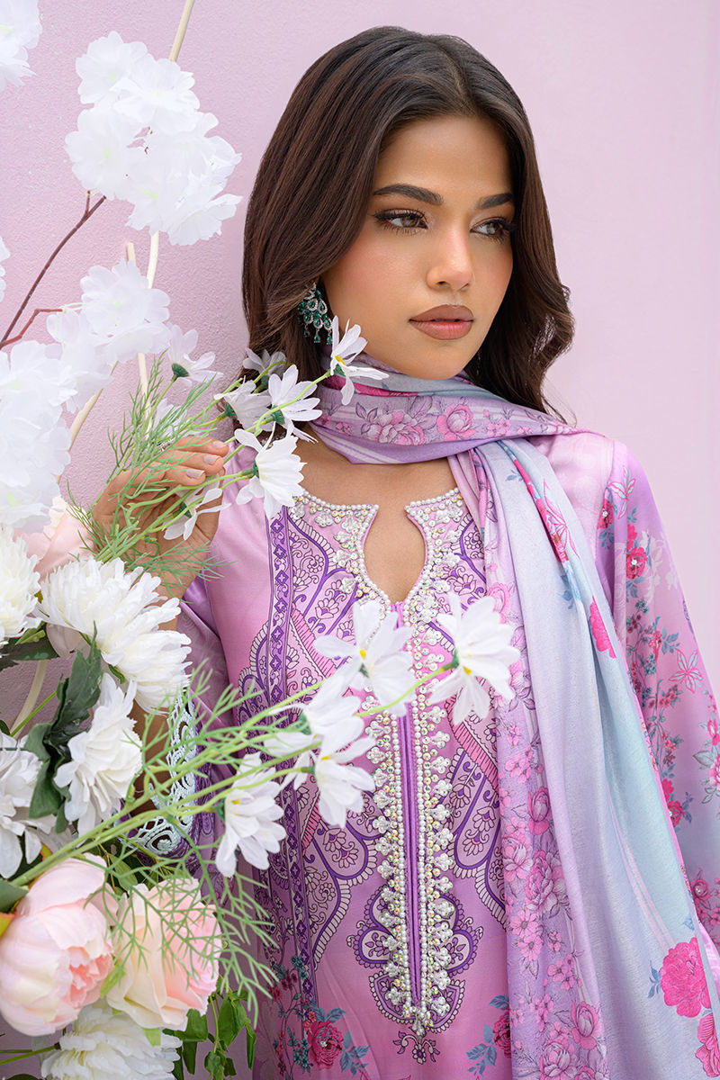 This elegant ensemble features a purple and blue digital printed long shirt. The neckline is beautifully embellished and finished with delicated lace detailing. The outfit is paired with coordinating culottes for a refined, contemporary look. A similarly printed medium silk dupatta completes the ensemble, adding a touch of effortless sophistication.
