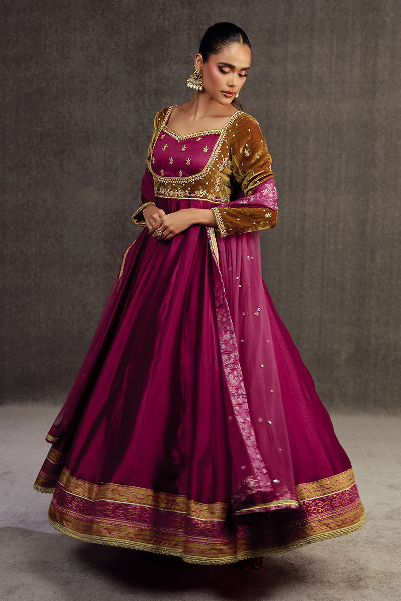 Color: Mehandi Green And Magenta Fabric: Velvet And Silk Work Details: Embellished And Block-Printed