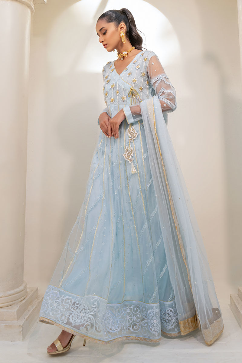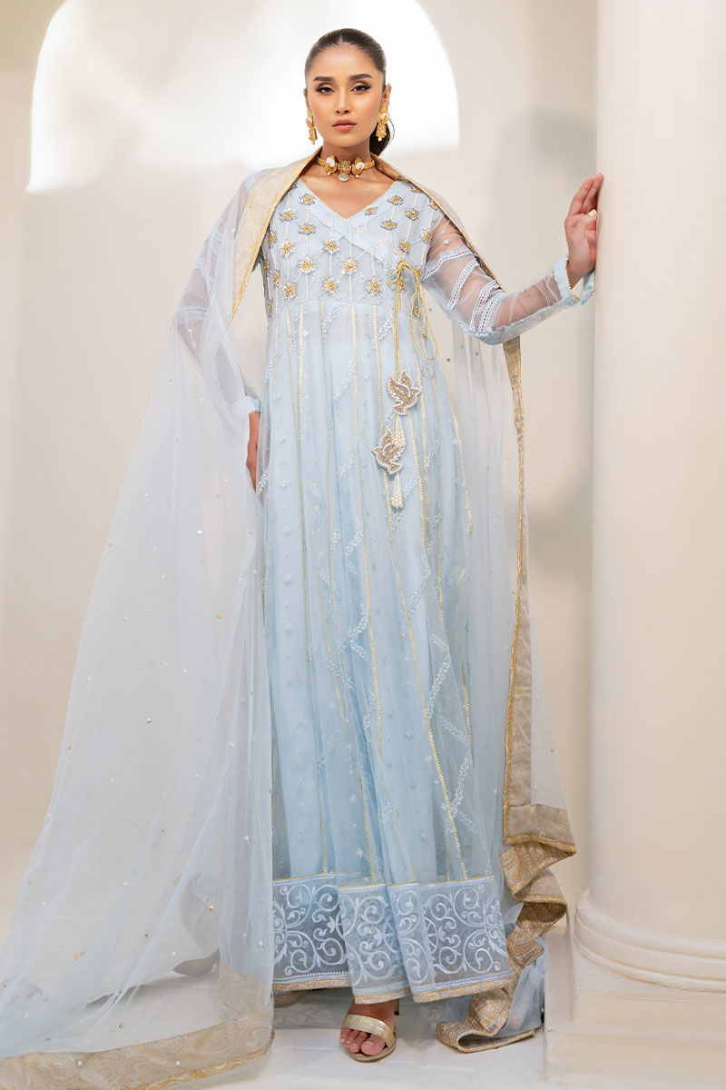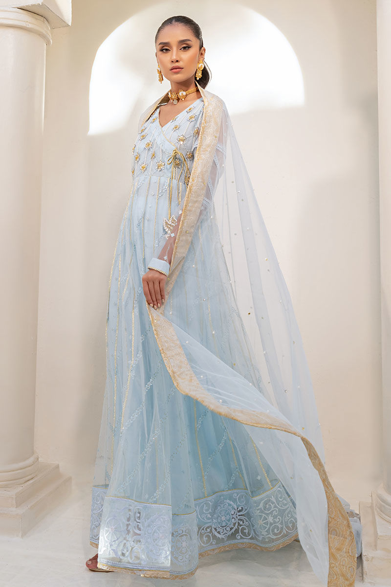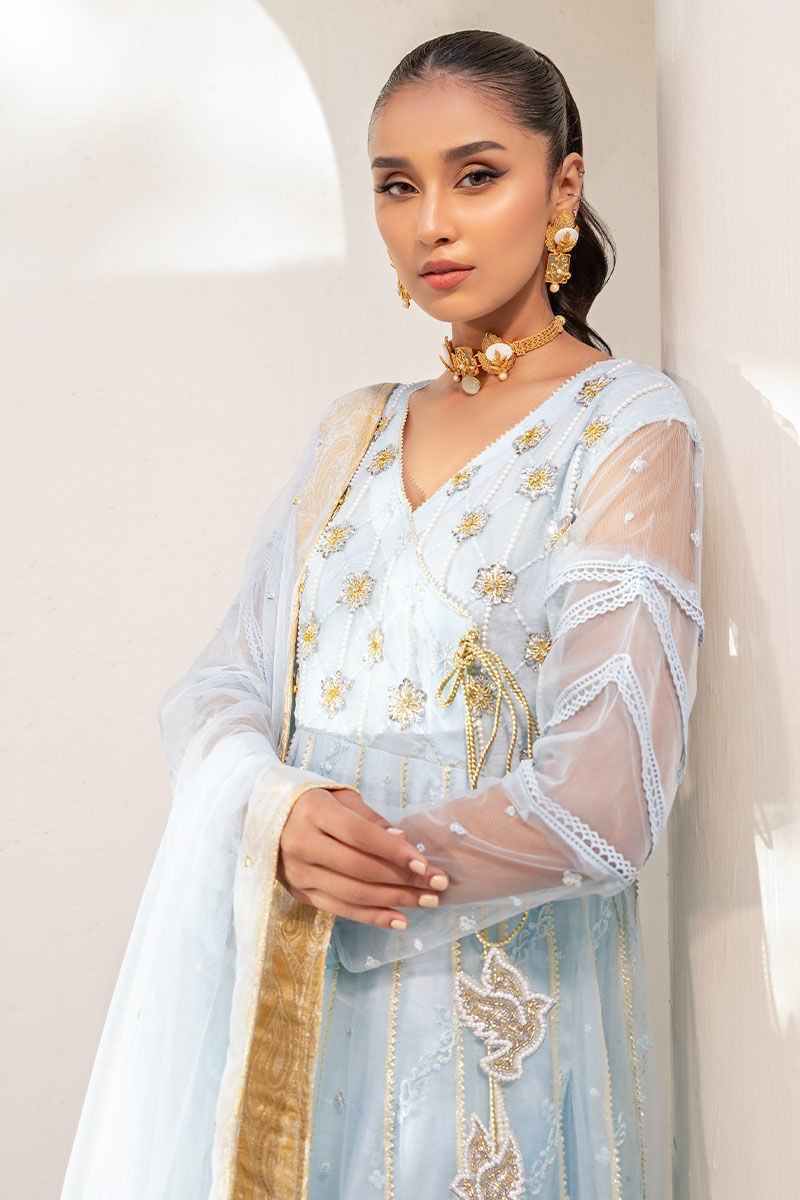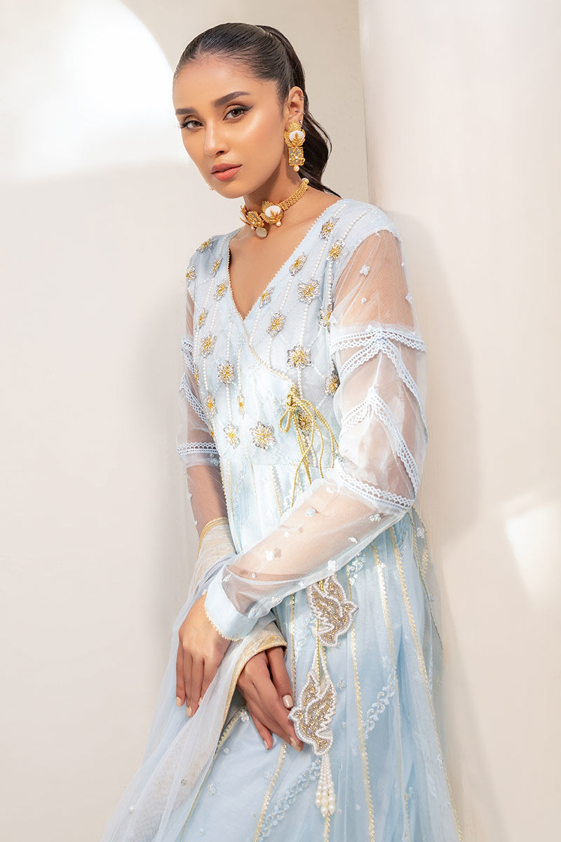 Insha presents a magnificent silhouette with its regal angharkha pishwas in buttery net fabric and a dreamy ice blue hue. Adorned with ornate embellishments, including an embroidered neckline and a matching dupatta, it exudes majestic charm and elegance.
