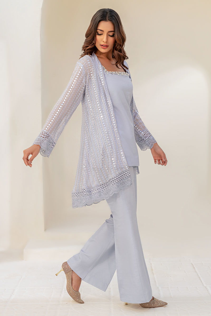 Color: Grey Fabric: Shirt: Chiffon, Pant: Silk Work Details: Embroidery and Hand Embellishment