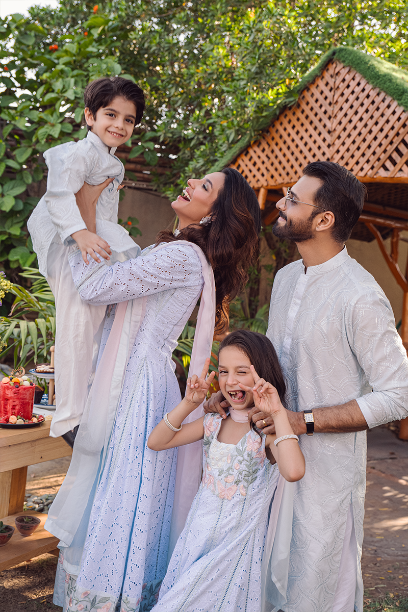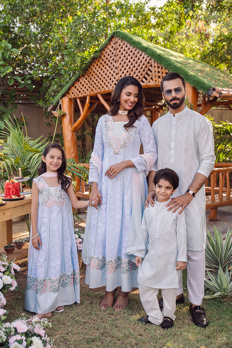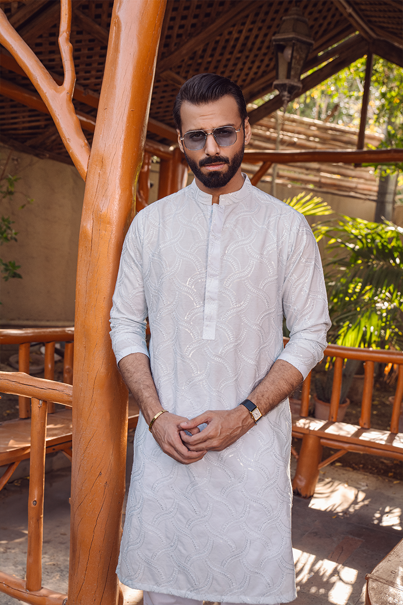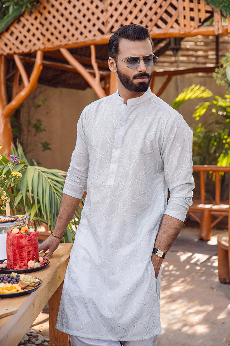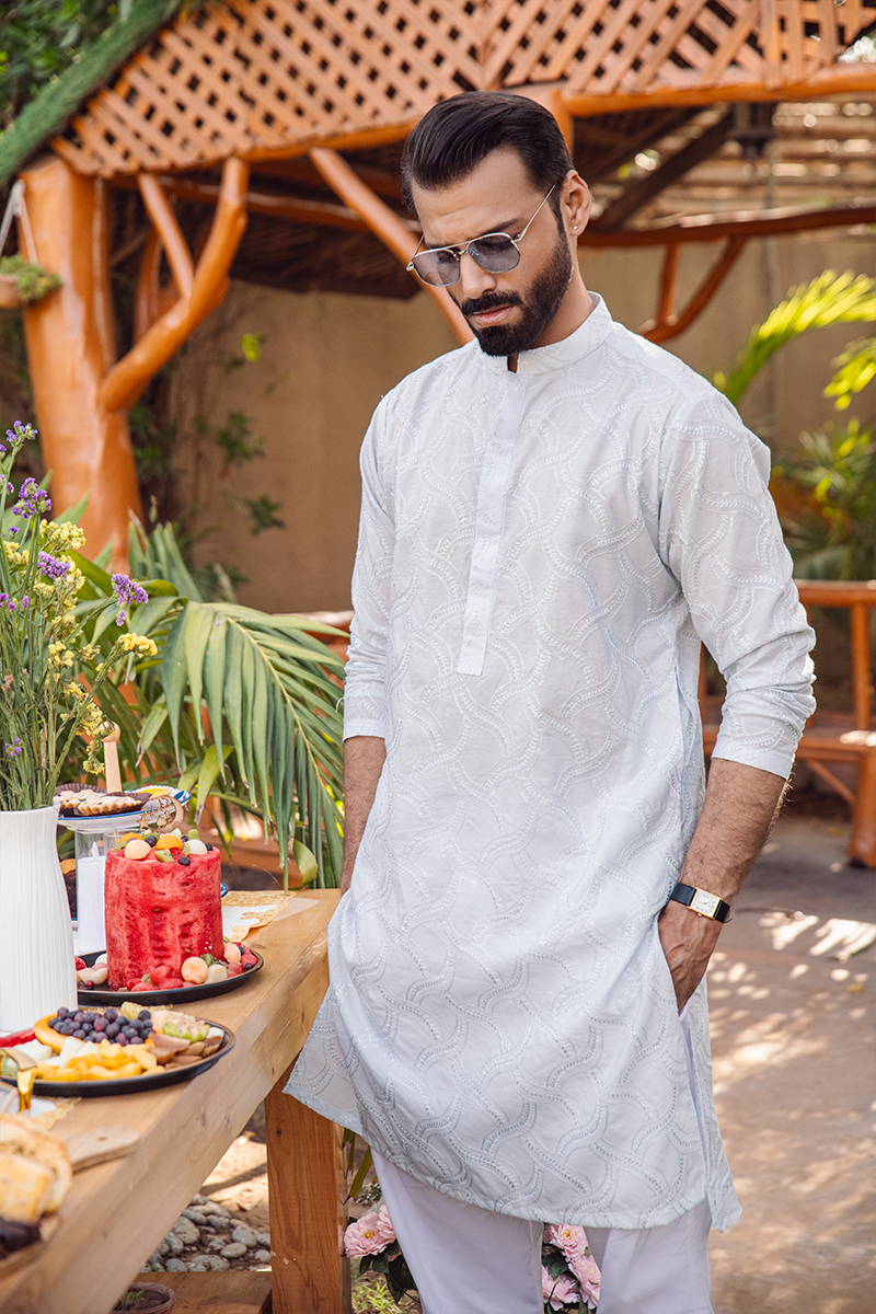 A kurta crafted from delicate ice blue cotton net, adorned with intricate textured embroidery in subtle blue hues. Paired with straight cotton pants, it creates a festive look that’s both elegant and refined.